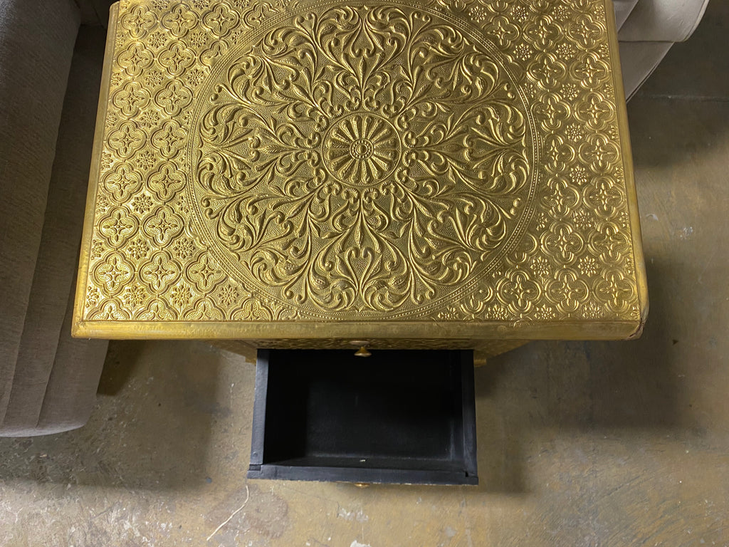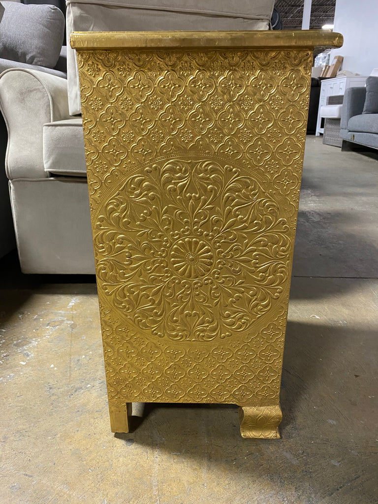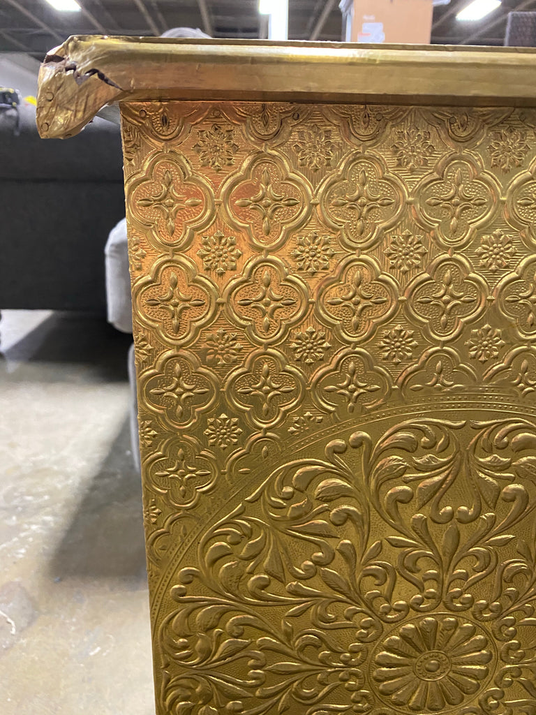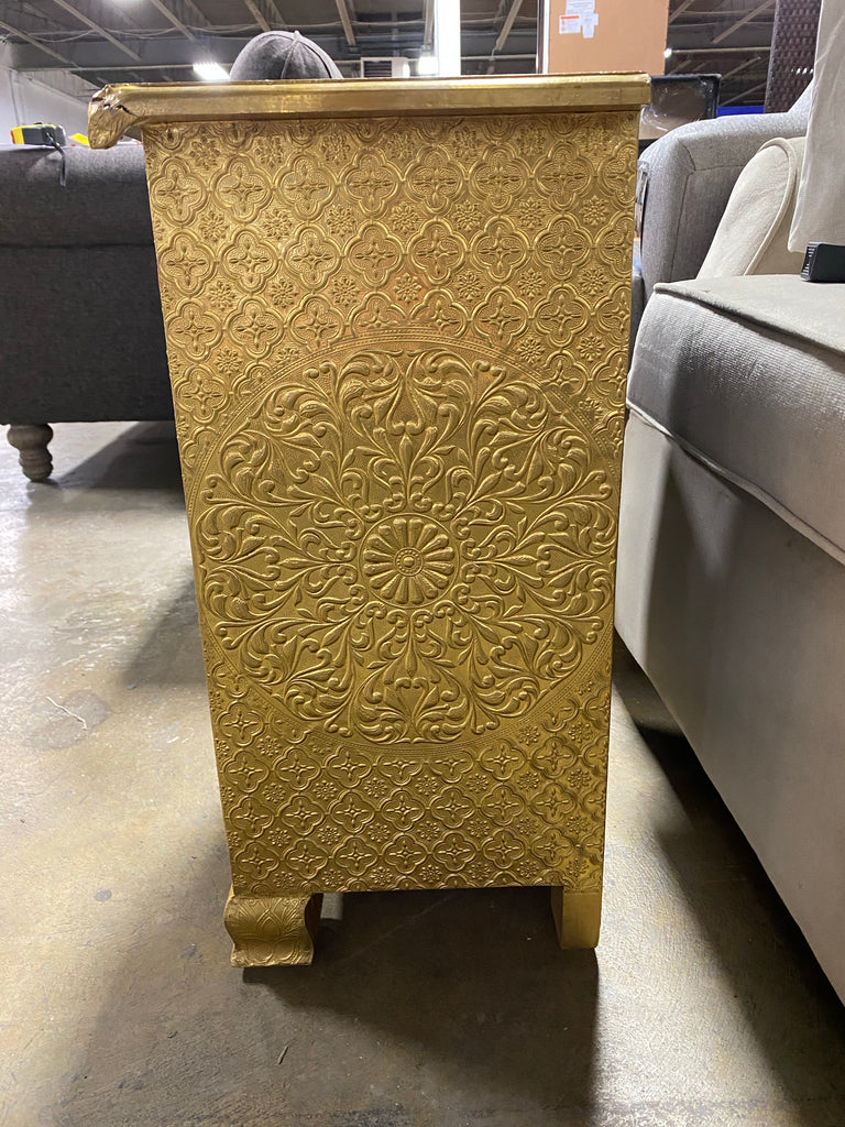 Item is in good condition. One corner has a dent; see photos for details/close-ups. Overall dimensions: 24"H x 12"W x 18"D. Color: Gold