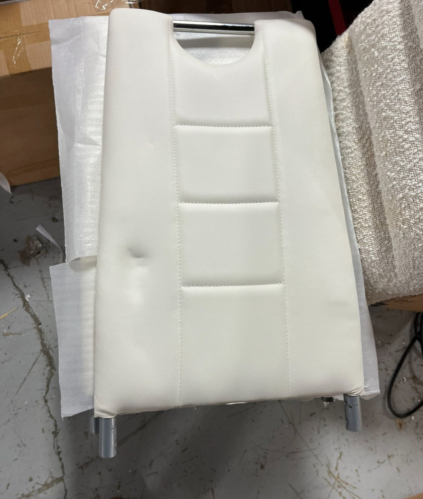 Note: Back of one chair has indent on fabric due to improper packing and may smooth out with time. Some hardware is present but customer will have to purchase additional screws and bolts. See below photo.
