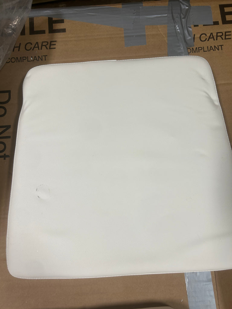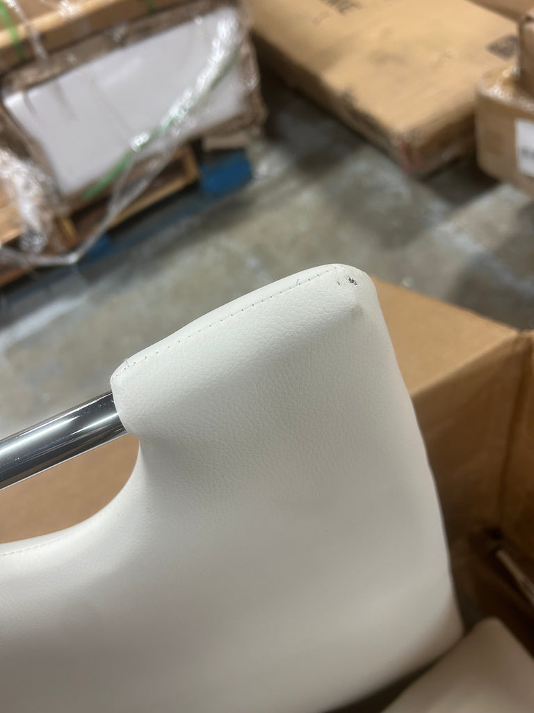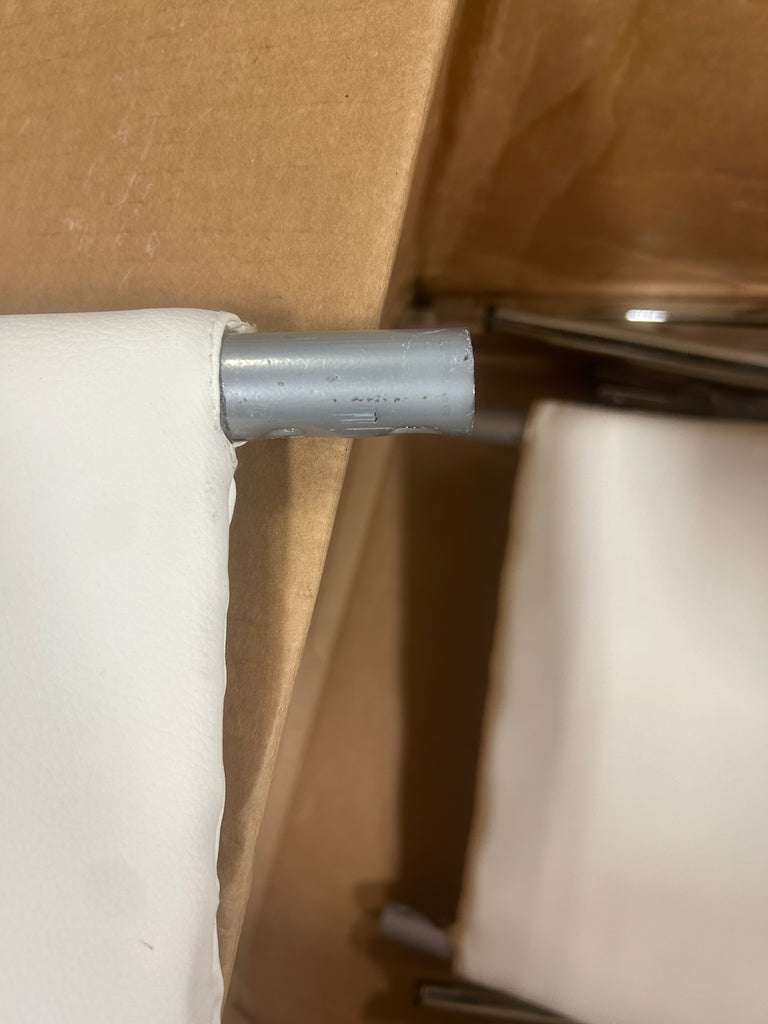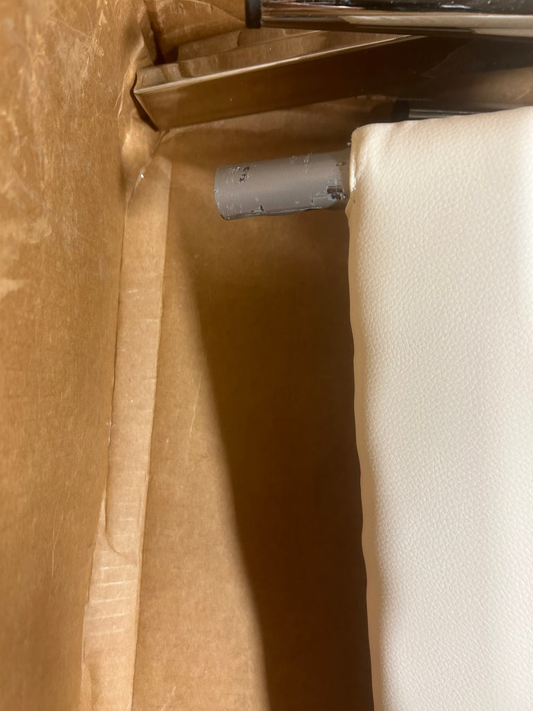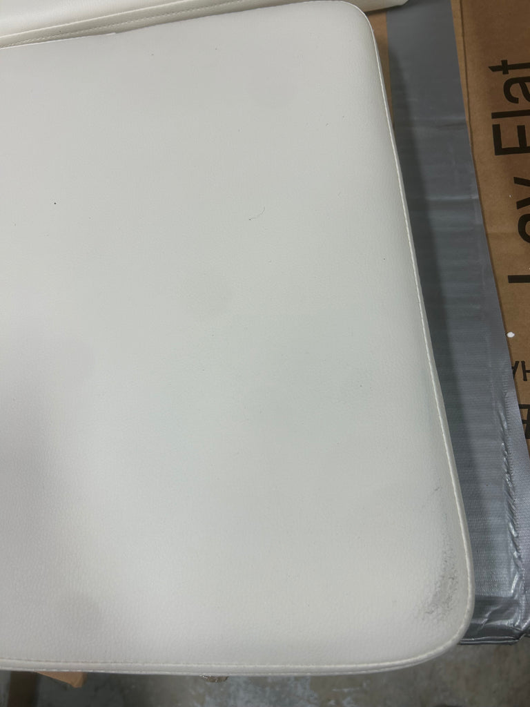 Note: There is a minor peeled area on one of the cushions. There is a small mark and a small dent from the corner on another cushion. On the top corner of the backrest there is a minor peel. There are a couple scratches on the backrest bottom part where legs attach. See in house photos for details.