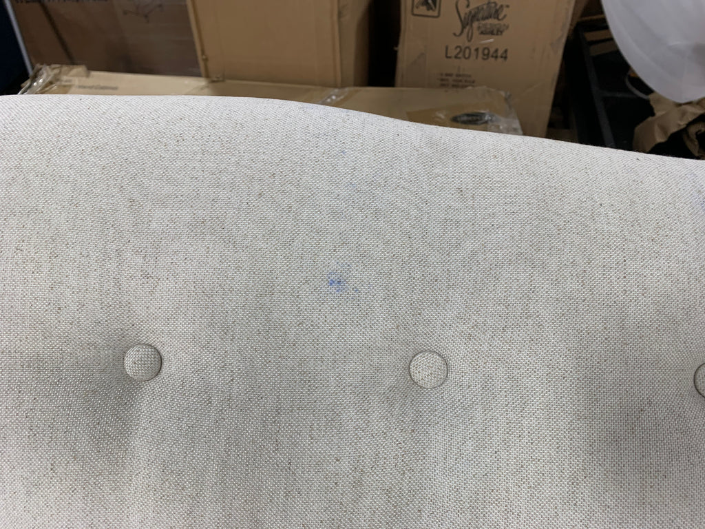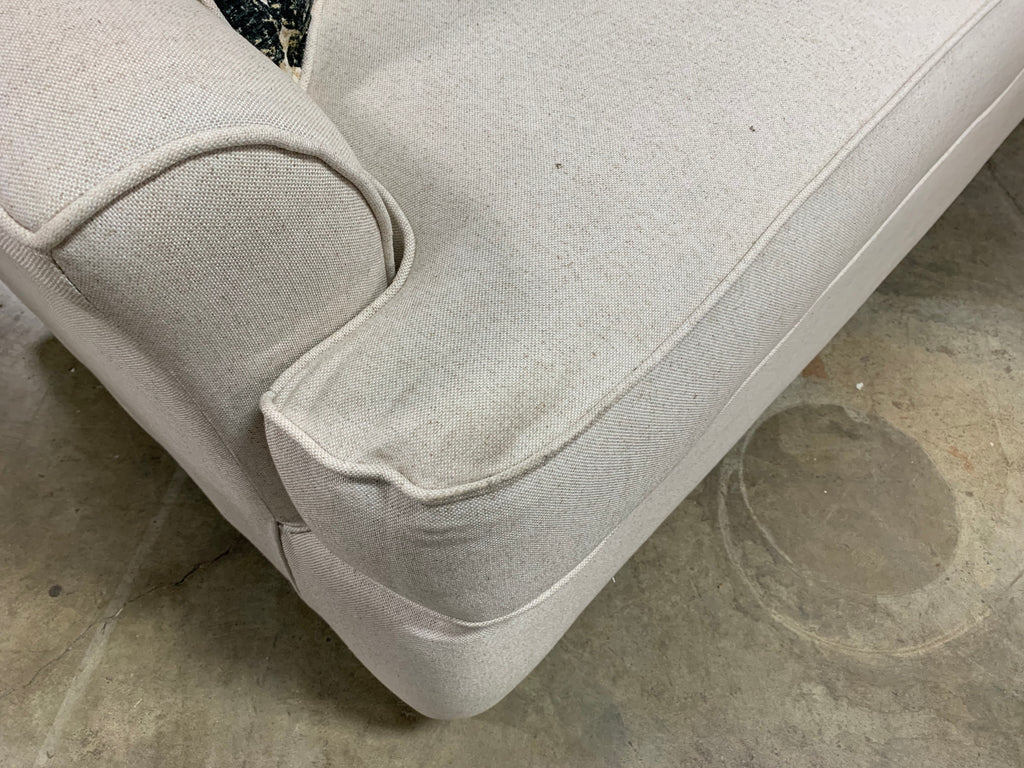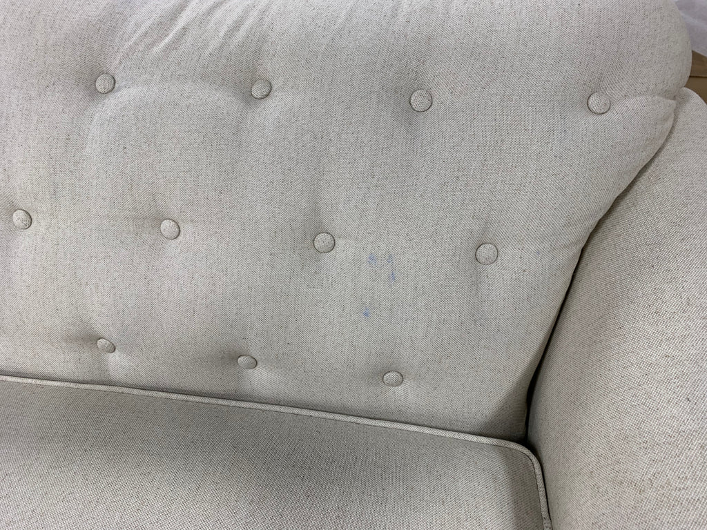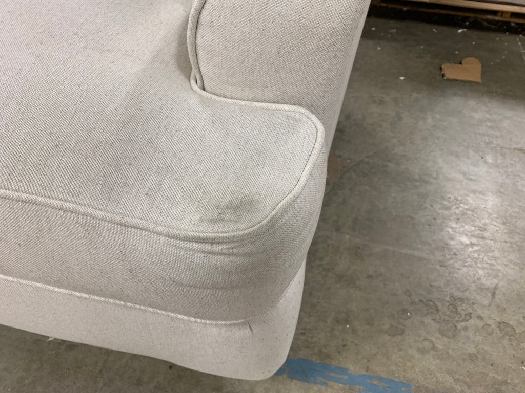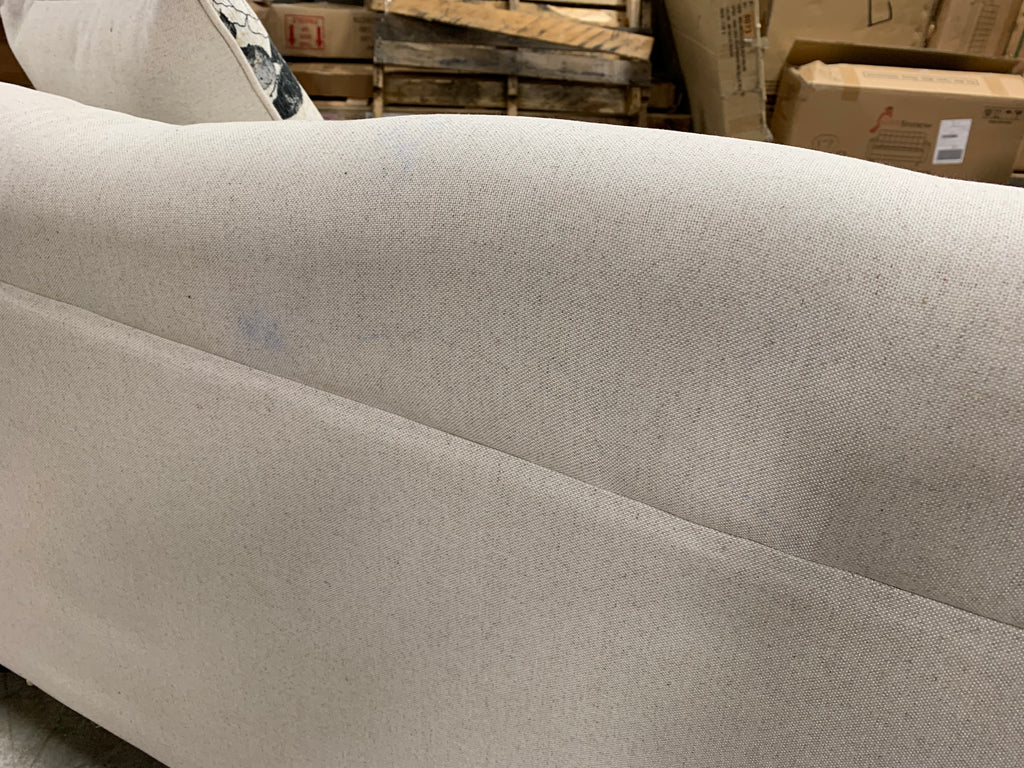 This sofa set is in great condition. On each cushion on the sofa there are some dust marks - shown in photos. The back panel has some blue marks on the front and back - shown in photos. No rips. Loveseat does not have any flaws to mention. Throw pillows included. Please see all photos and the link below for more details.