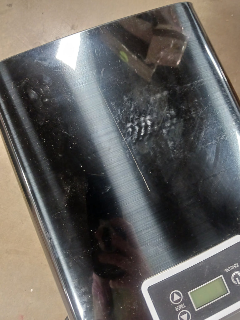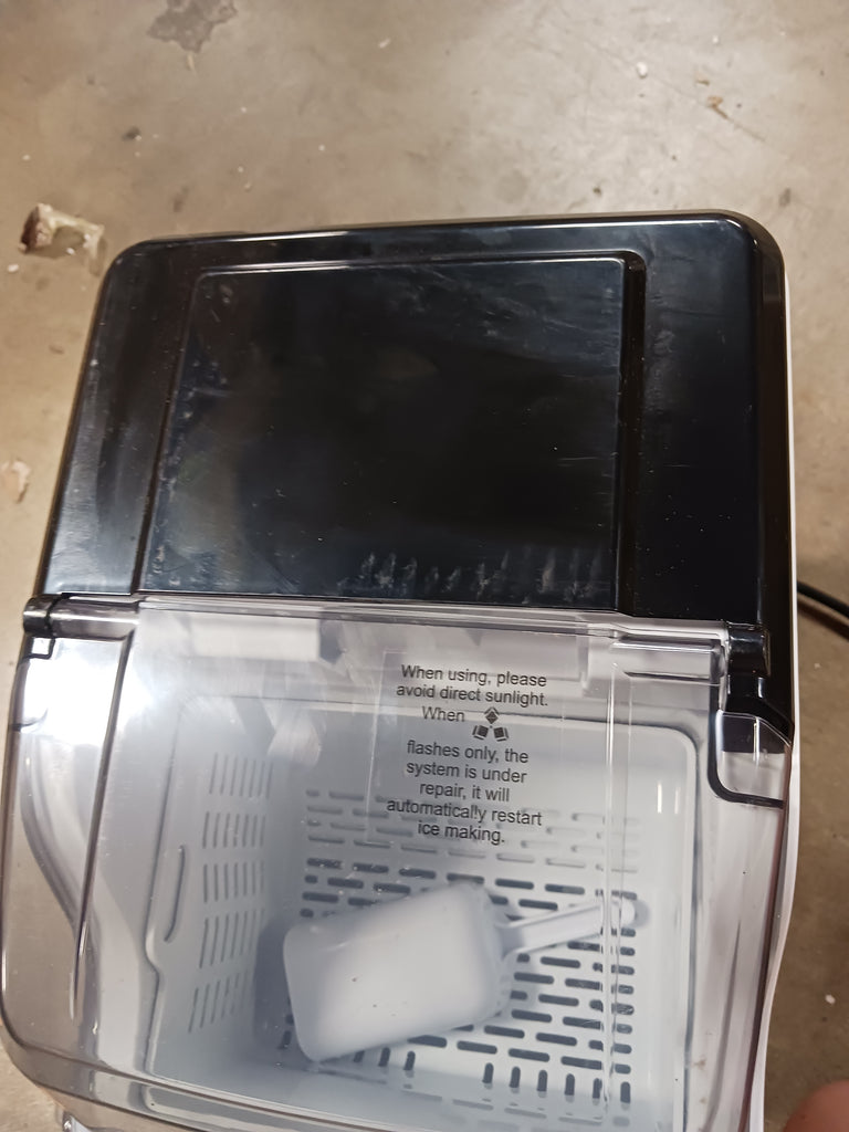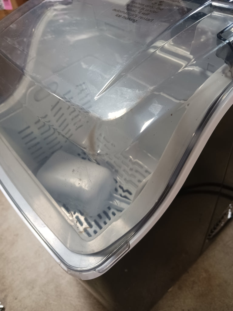 Note: This ice maker has been plugged in and does turn on! There is scuffing throughout. There are also some dings on the front edge of this ice maker. The lid has one screw that fell out so one side needs to be restabalized. There is also a scratch on the front. See the photos provided.
