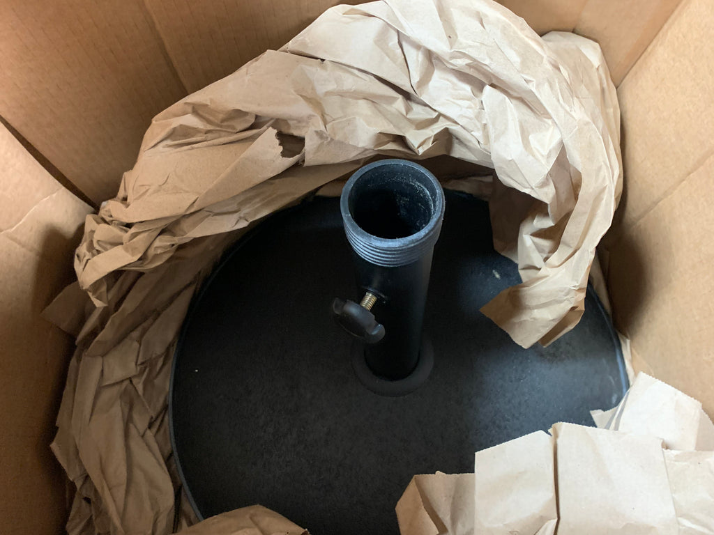 Note: This umbrella base is missing the small black plastic piece that helps connect the rest of the umbrella. Please see in-house photos for more details.