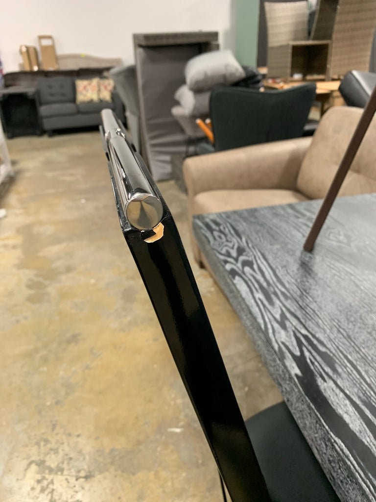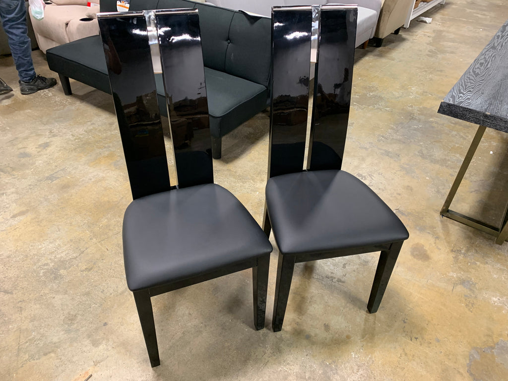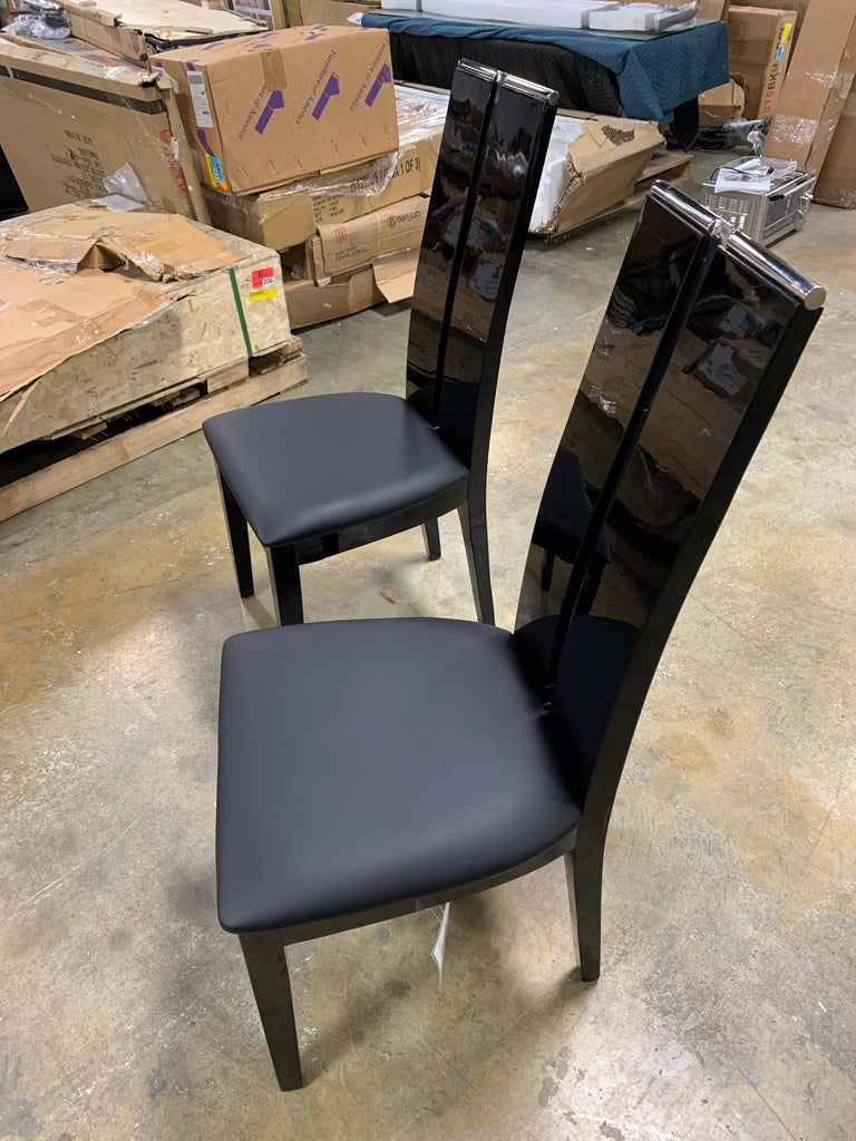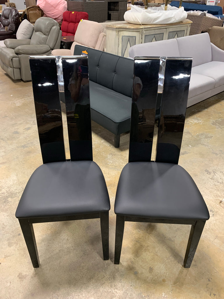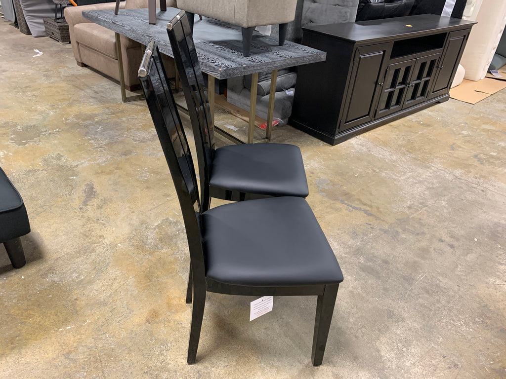 These dining chairs are in good condition. Seat upholstery is black faux leather. Some chips in the paint on the top of one - shown in photos. There are chips in the wood on the bottom of each chair on the back of the legs - shown in photos. Please see all photos before purchasing.
