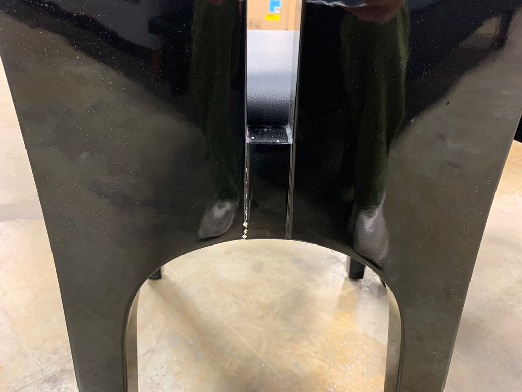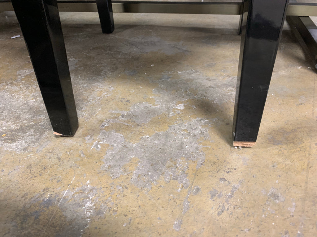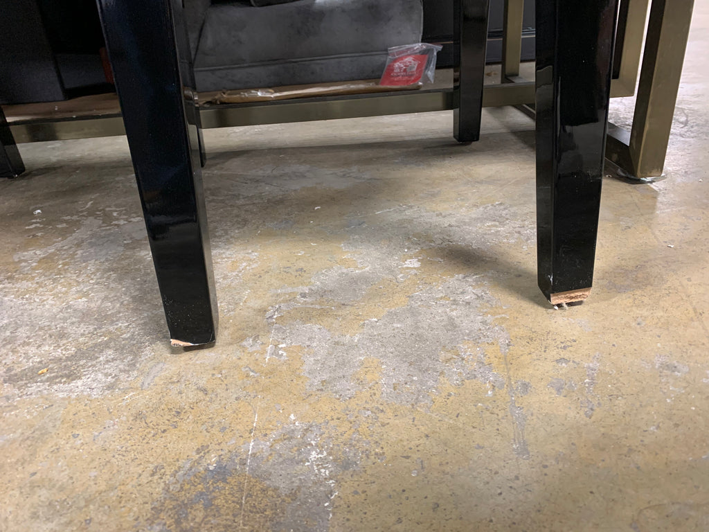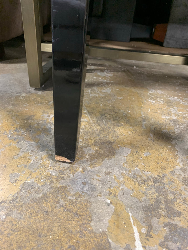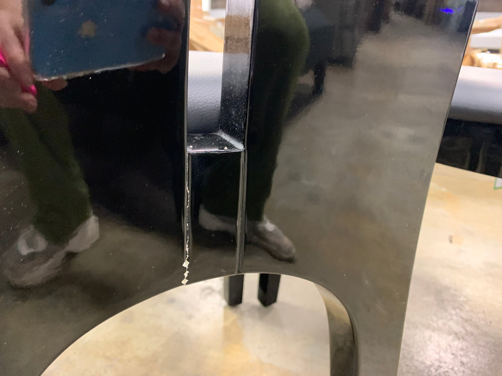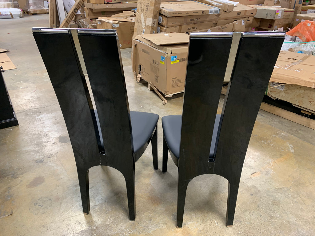 These dining chairs are in good condition. Seat upholstery is black faux leather. Some chips in the paint on the top of one - shown in photos. There are chips in the wood on the bottom of each chair on the back of the legs - shown in photos. Please see all photos before purchasing.