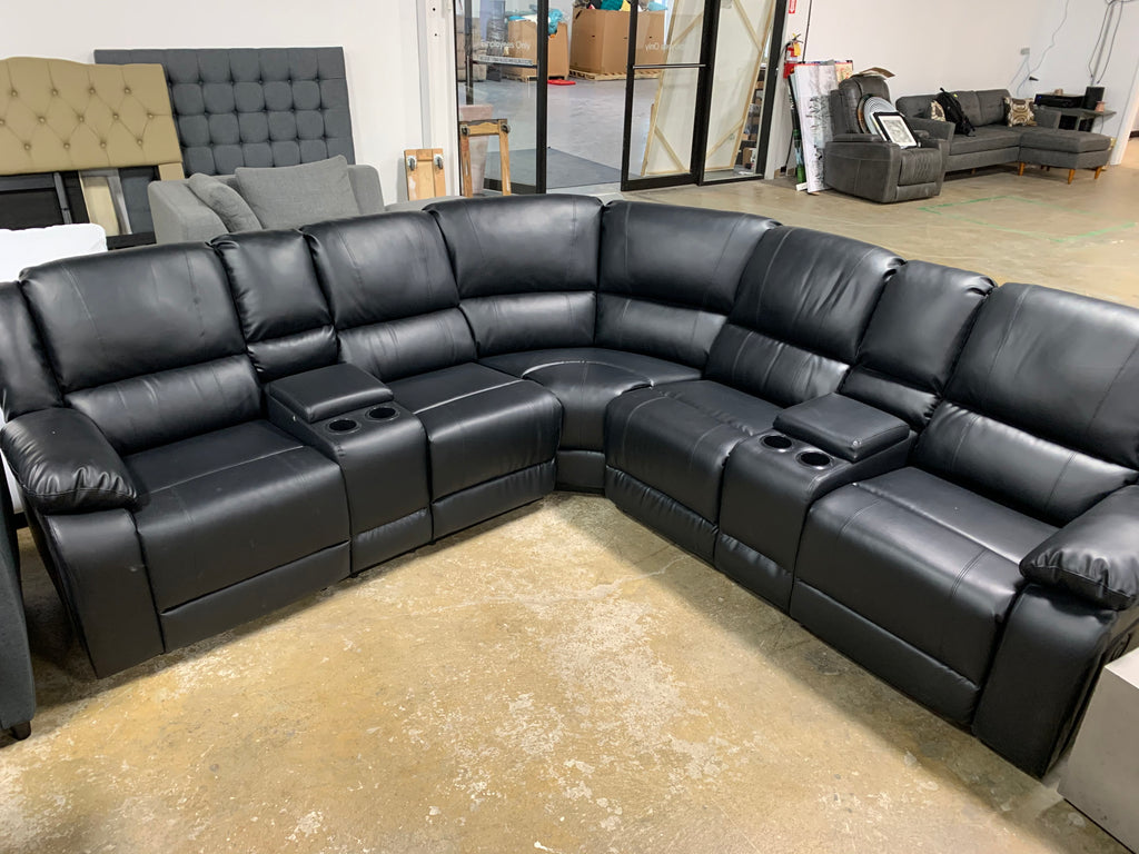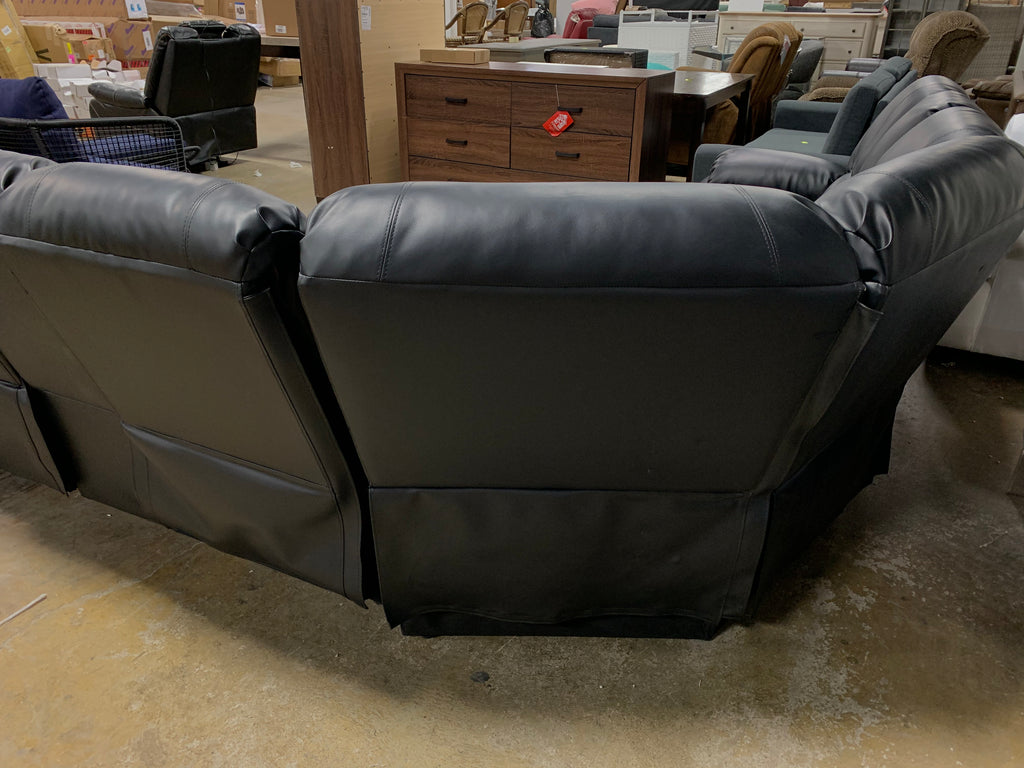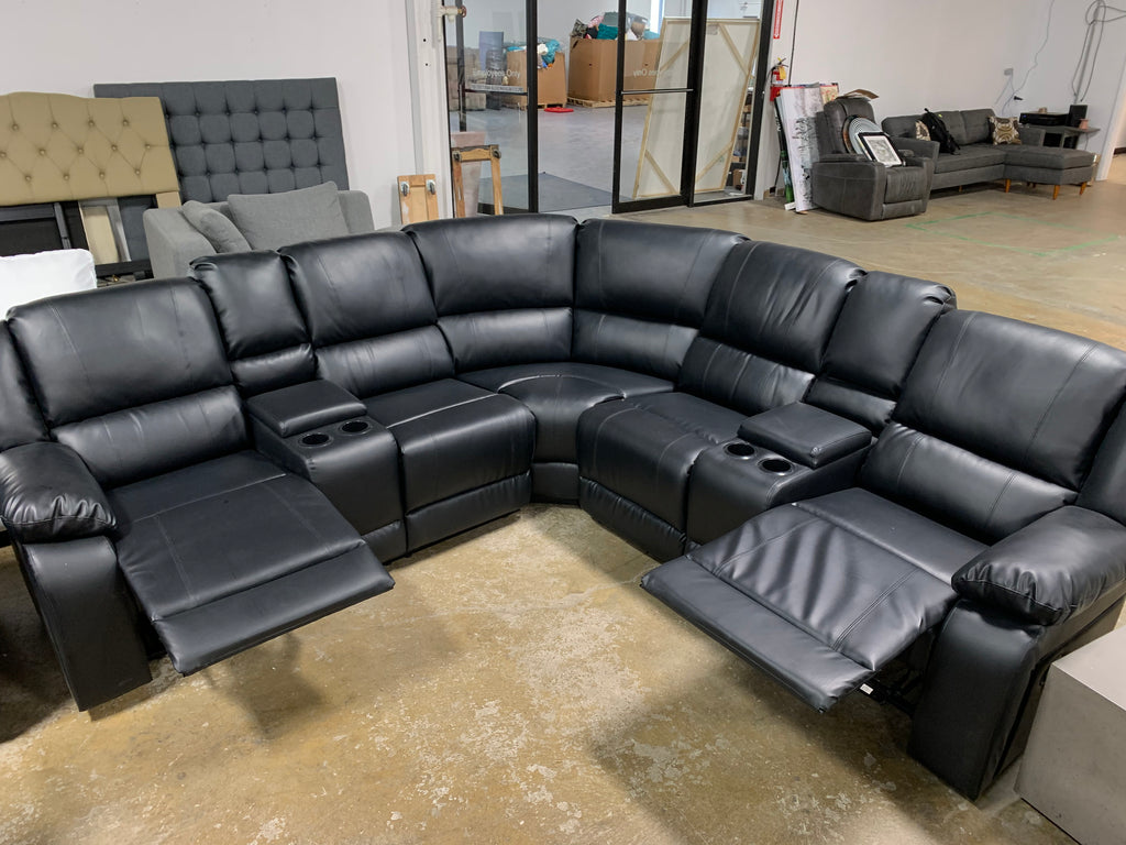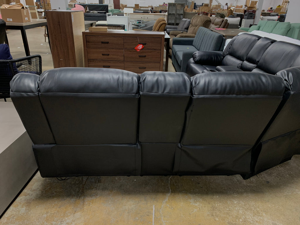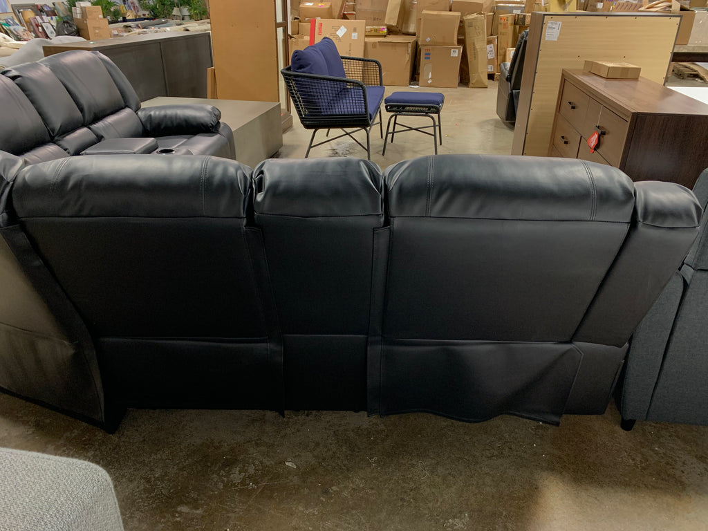 In GREAT condition. Black faux leather. Both sides recline. Two consoles and 4 cup holders. Please see all photos for details.