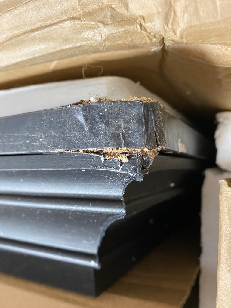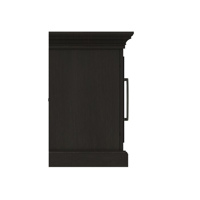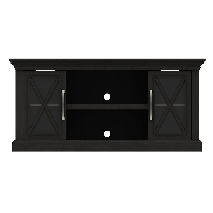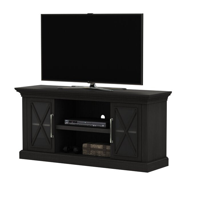 Item is in good condition. This is an opened in-box item. Assembly required. **There is a dent on a corner of the tv stand. See in-house photos for details.** Finish: Black