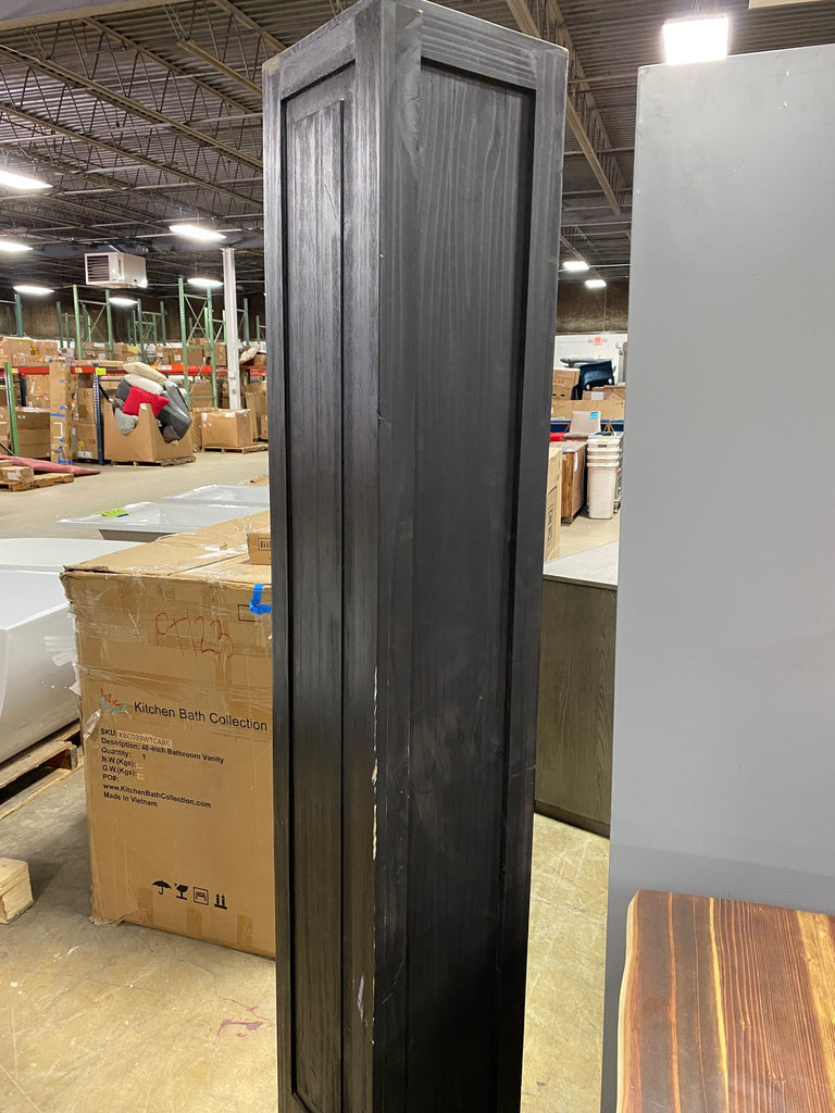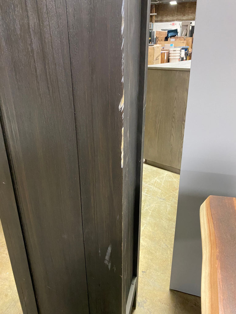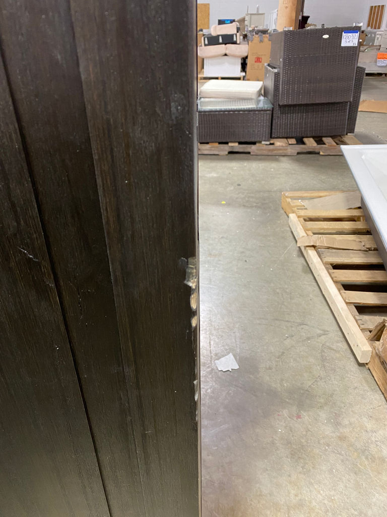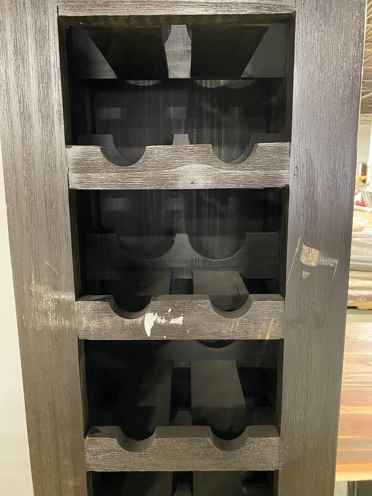 Out of box, The color is brown, AS IS - Wine rack does NOT include the two drawers on the bottom, as seen in stock photo. The item is slightly unlevel and leans a little. It also has multiple dents and scuffs on the surface. Please see in-house photos for more details.