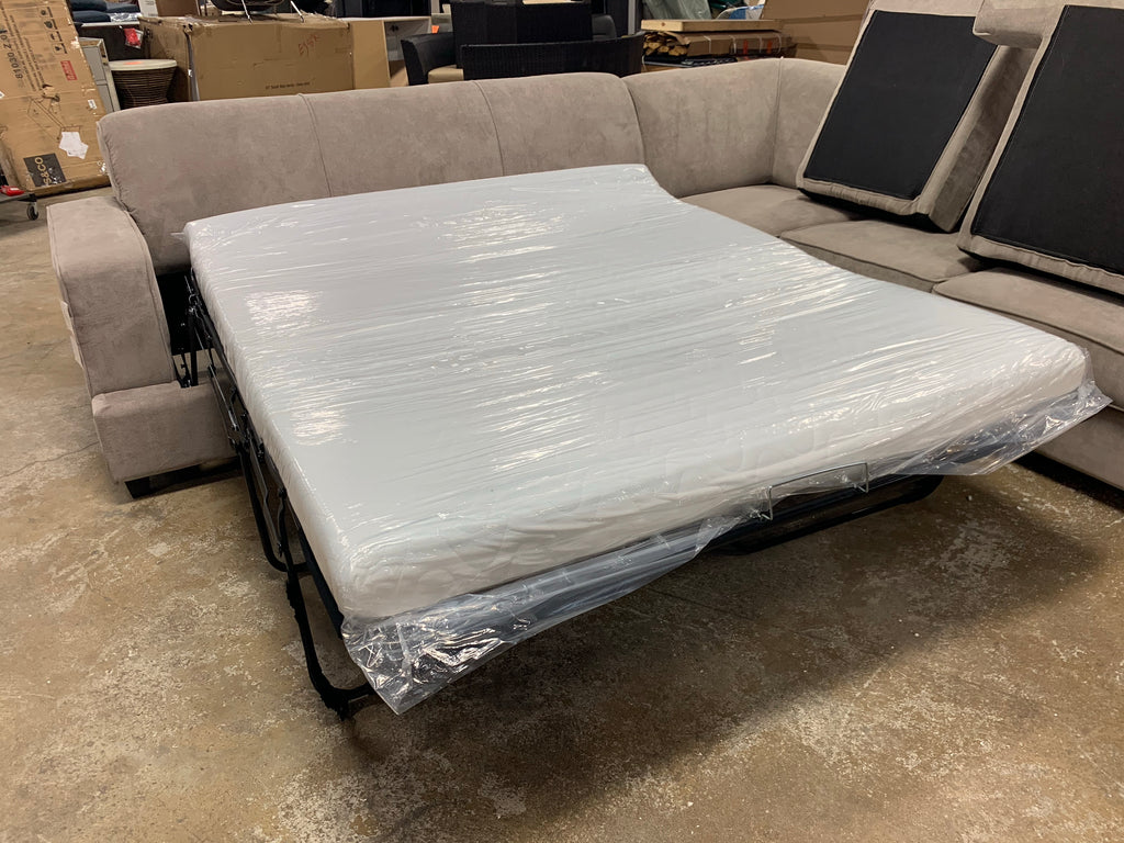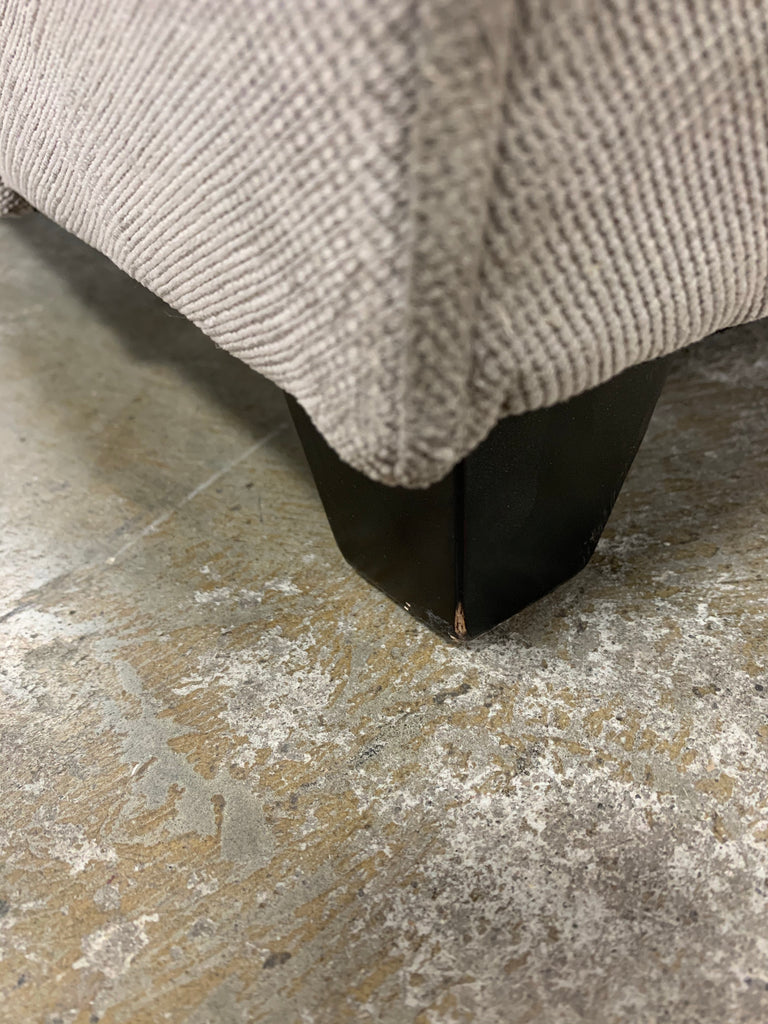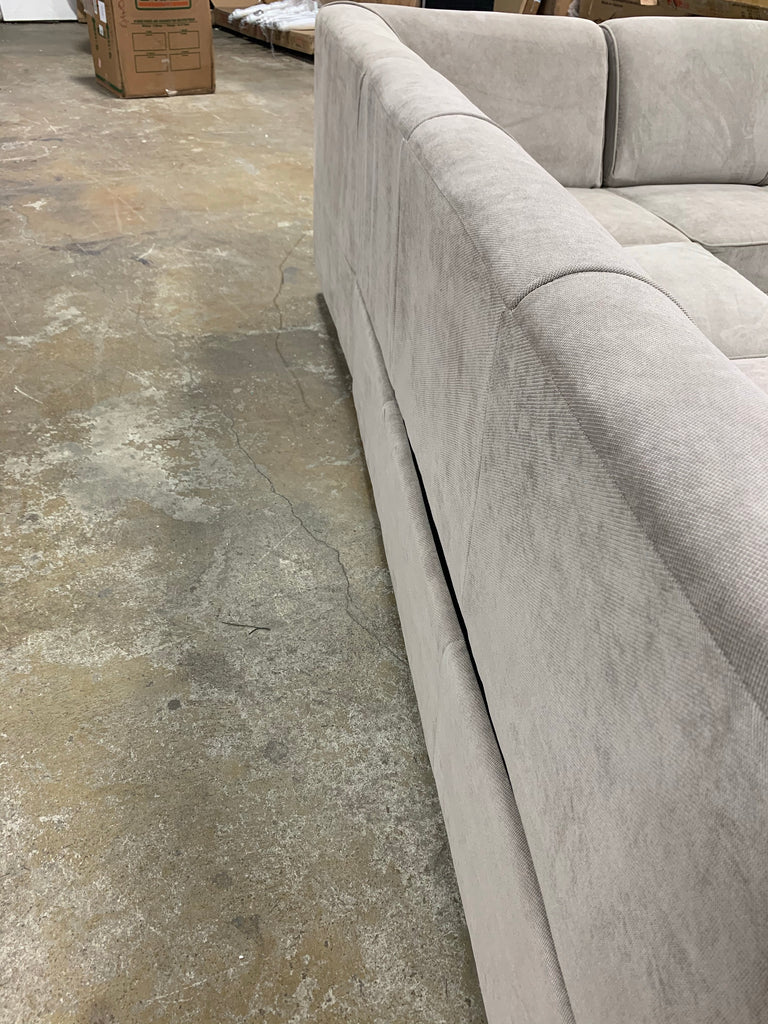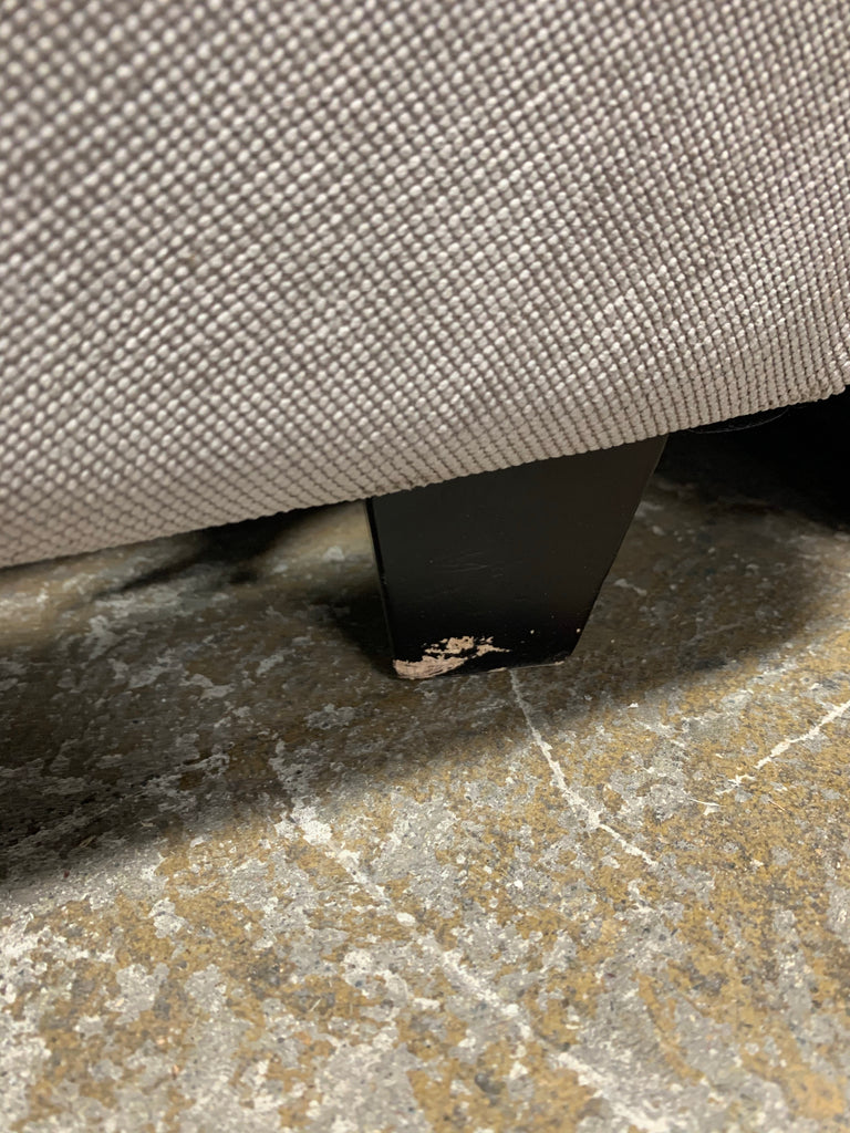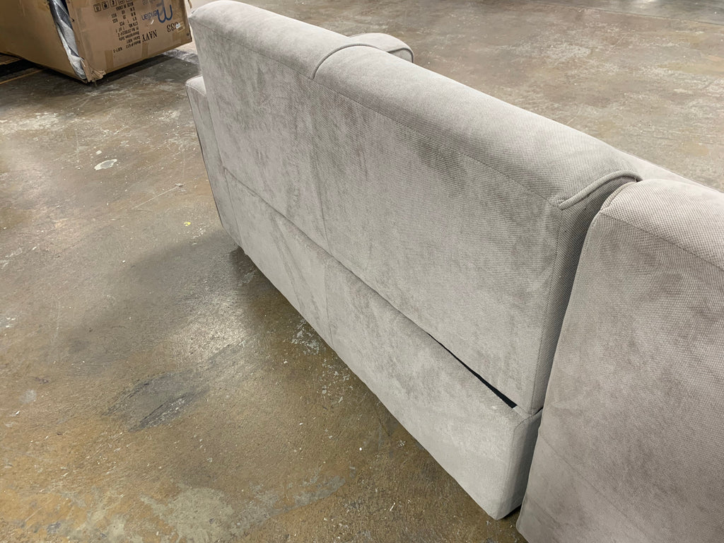 Out of box. Upholstery shows a bit of warehouse dust. Sleeper has been opened/closed and works well, still in original packaging. Some of the wood legs show minor chipping. On the backside, there is a small gap where backrest meets seat, could be adjusted. Please see all in-house photos.