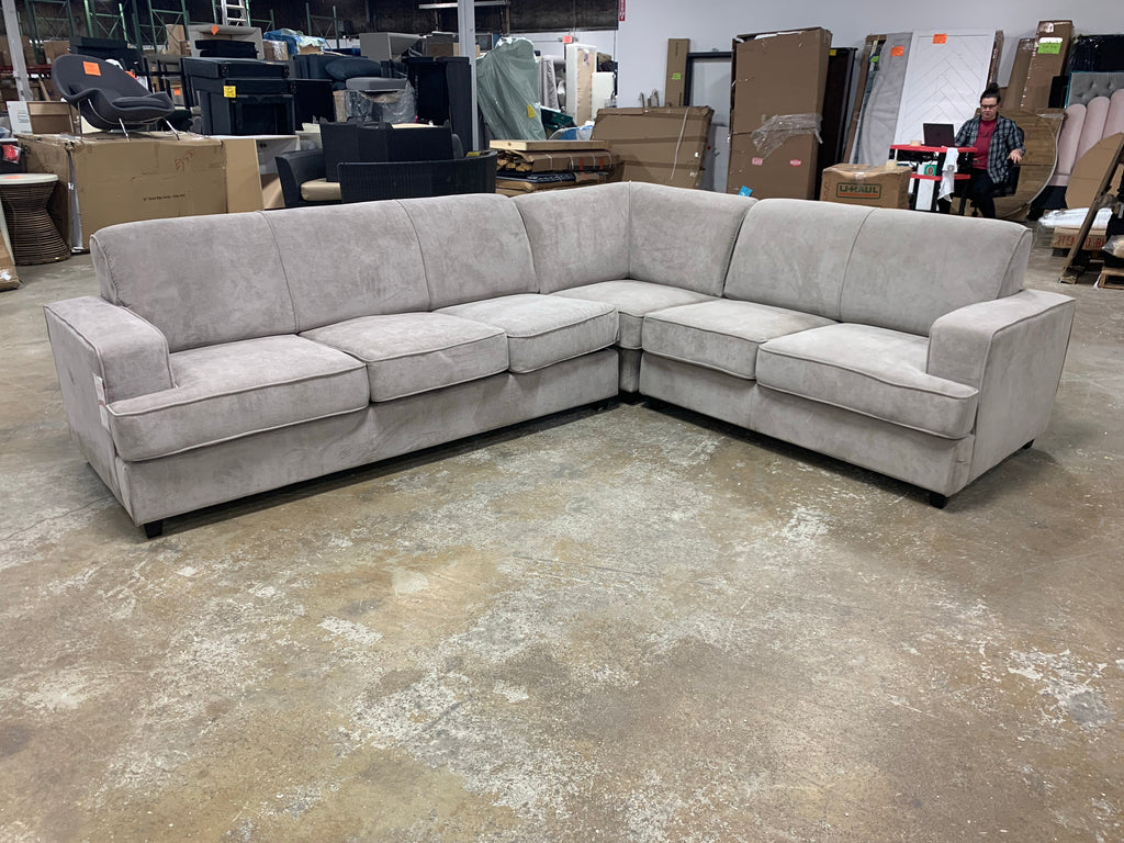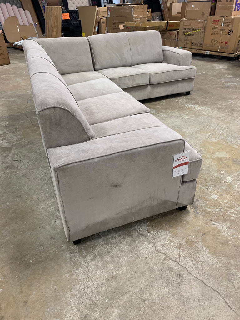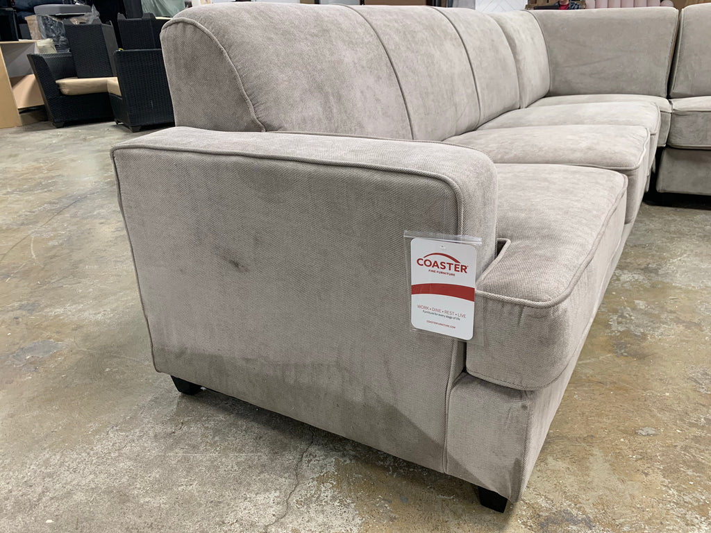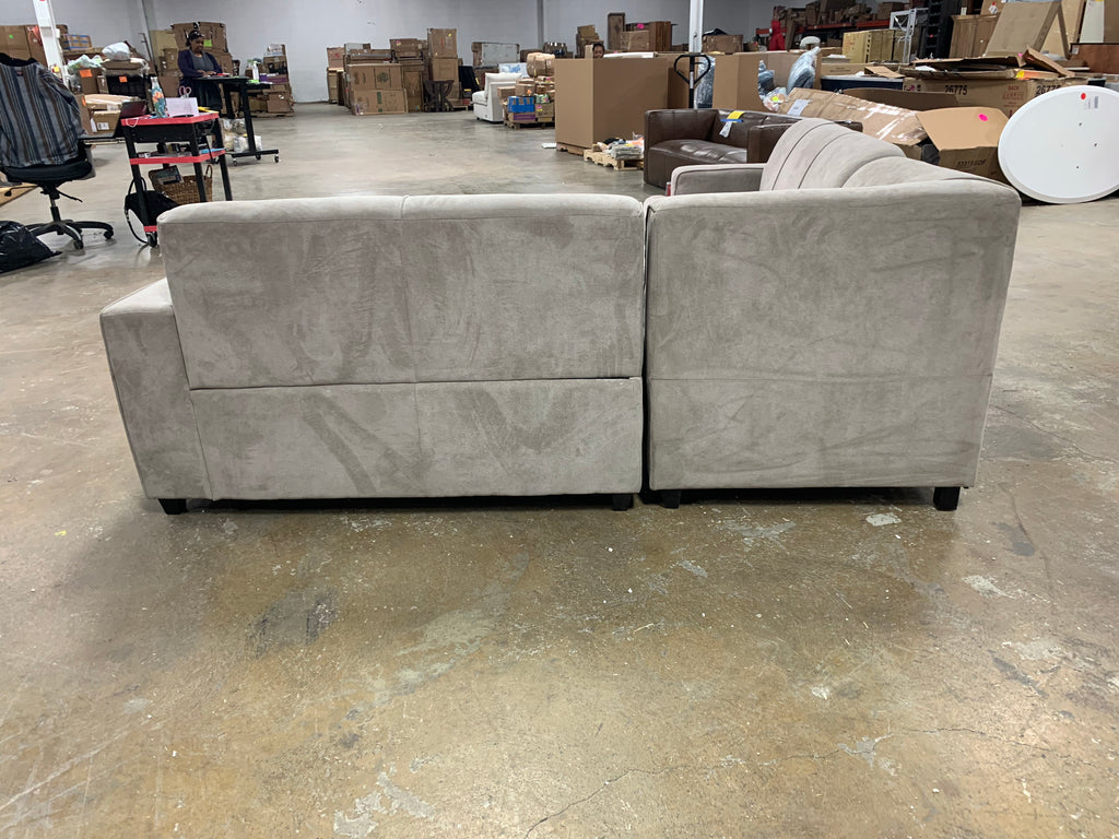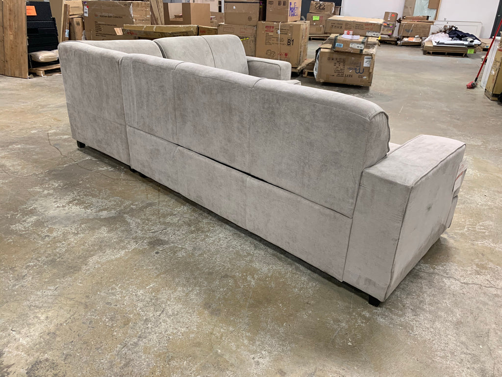 Out of box. Upholstery shows a bit of warehouse dust. Sleeper has been opened/closed and works well, still in original packaging. Some of the wood legs show minor chipping. On the backside, there is a small gap where backrest meets seat, could be adjusted. Please see all in-house photos.