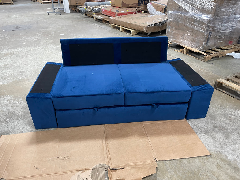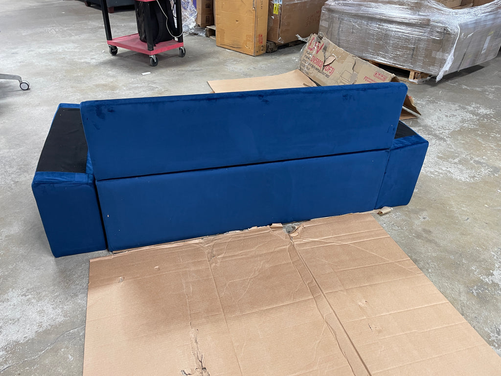Out of box partial blue velvet sofa. It is missing the legs and the back/arm cushions. There is some warehouse debris on velvet and some overall slight imperfections in the velvet. See pics.