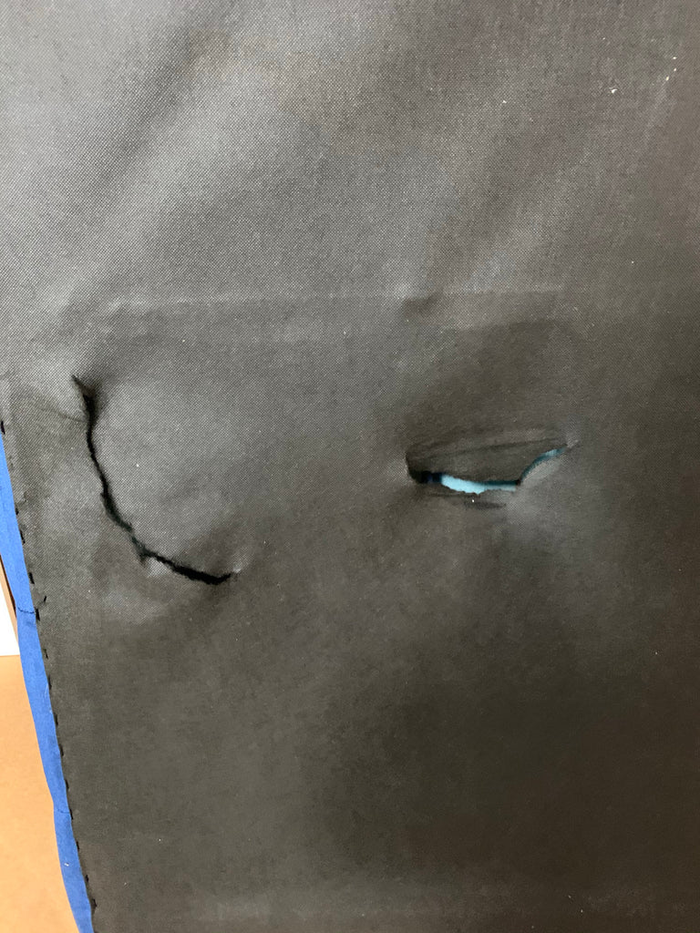 Sofa is out of box, only imperfection is a small upholstery tear on the front of of sofa and hole in the bottom dust cover. Please see all photos.
