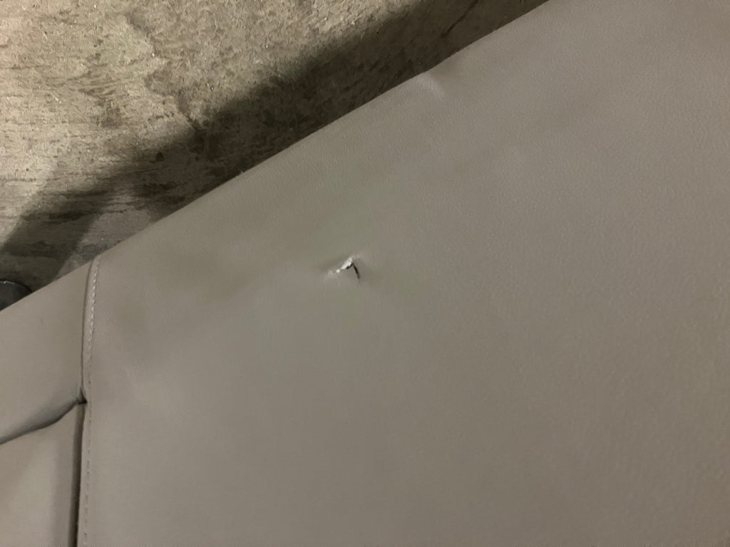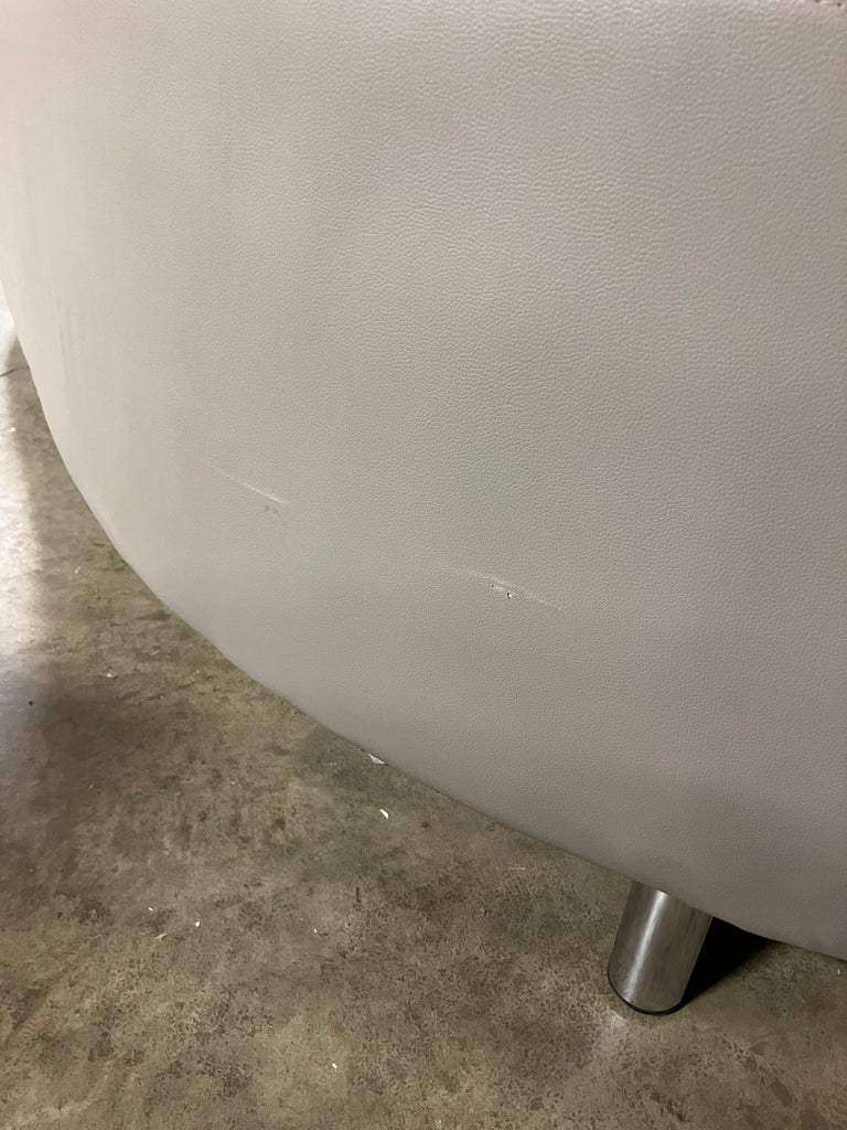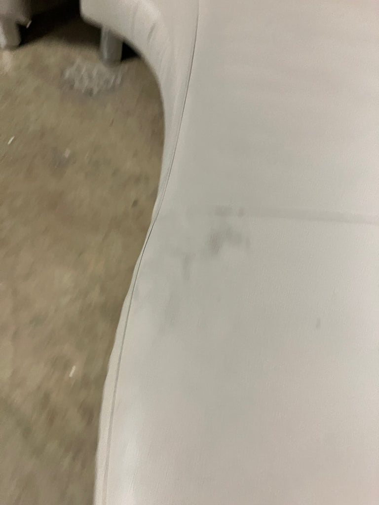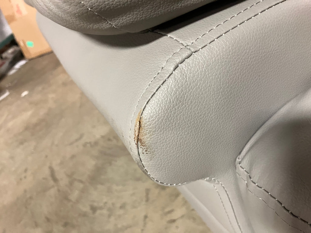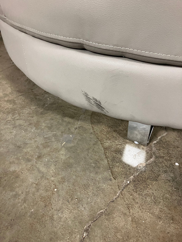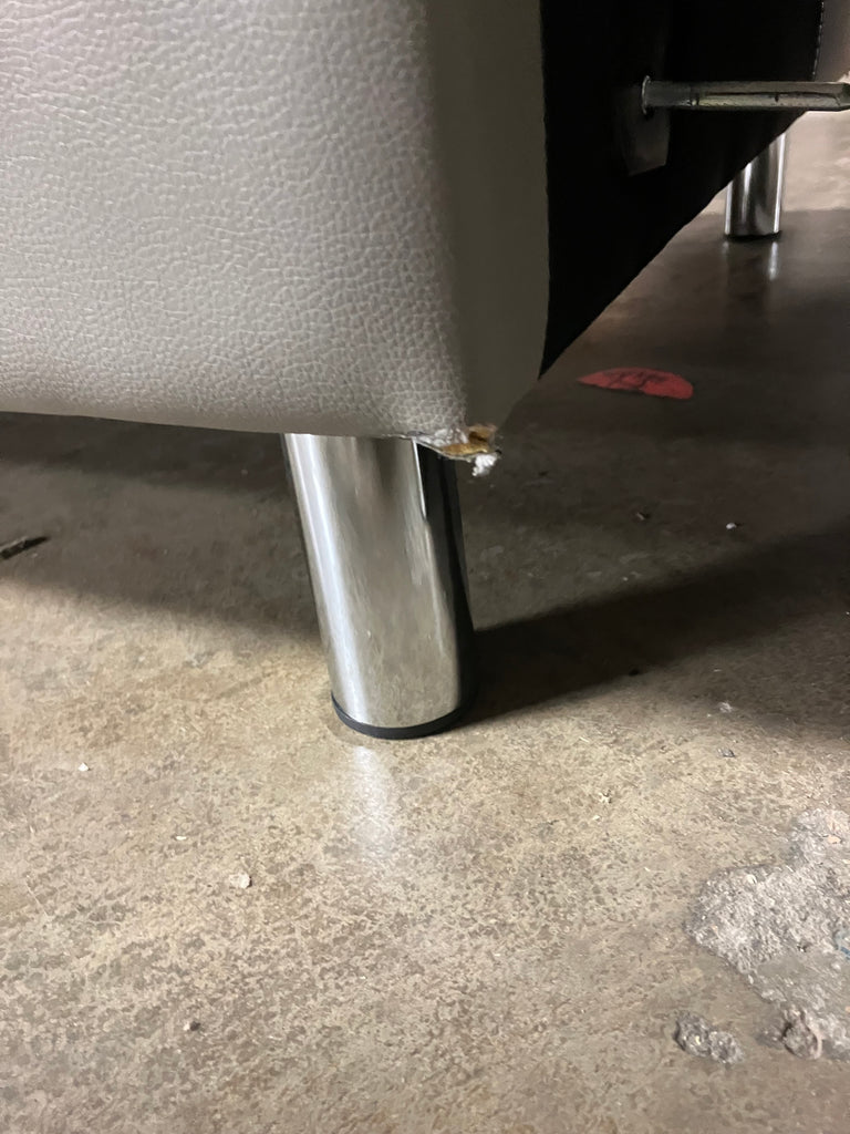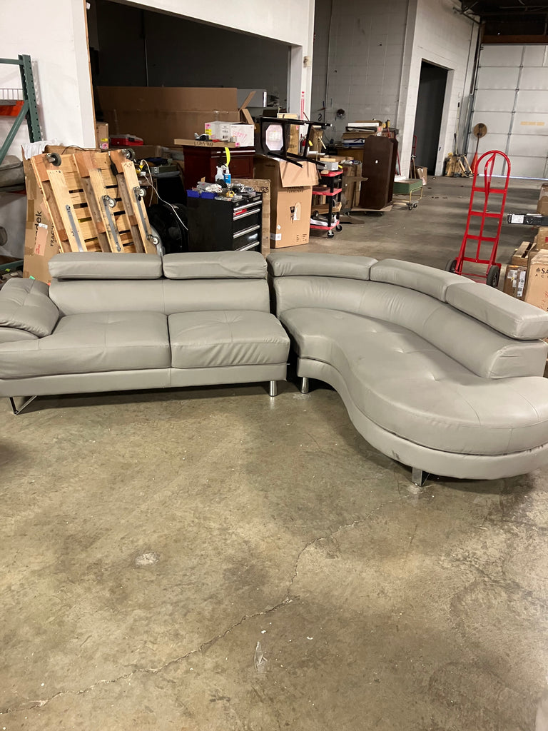 Note: Out of box item comes in 2 pieces. Has some warehouse dust/spotting throughout but all seems to wipe off. Has a small tear on back of couch. Missing 2 screws for one leg. Otherwise a very nice sectional.