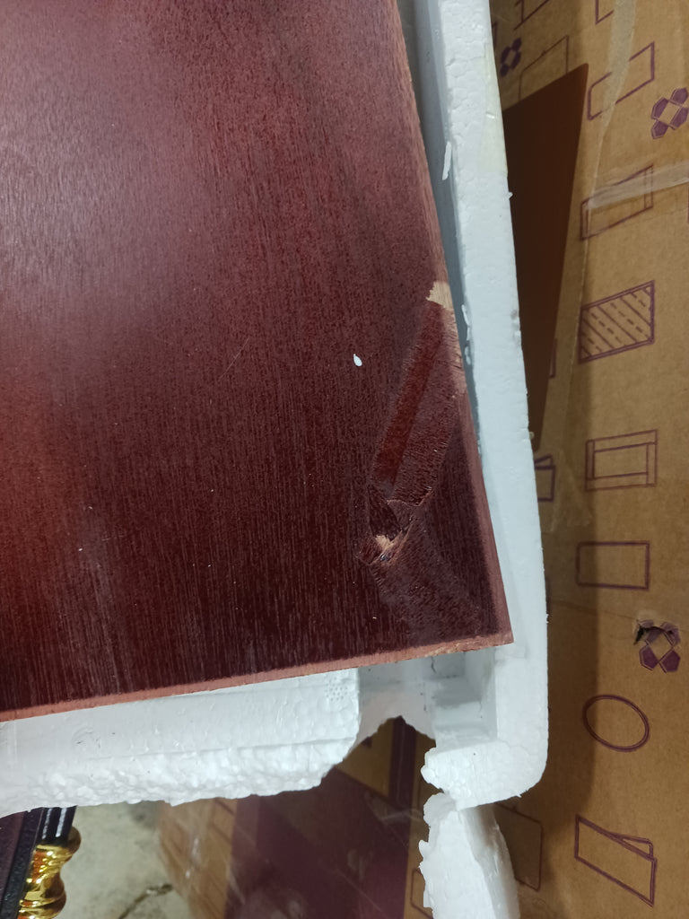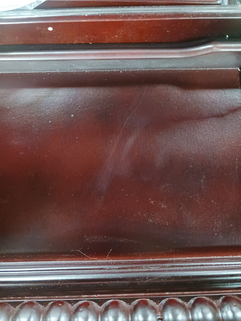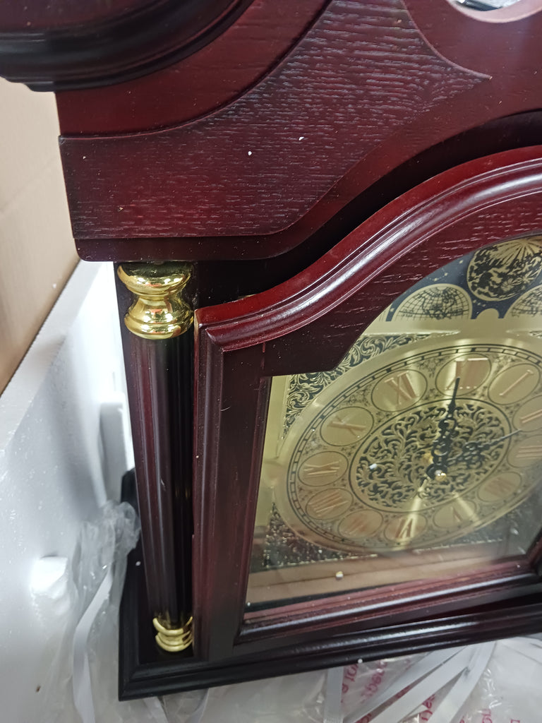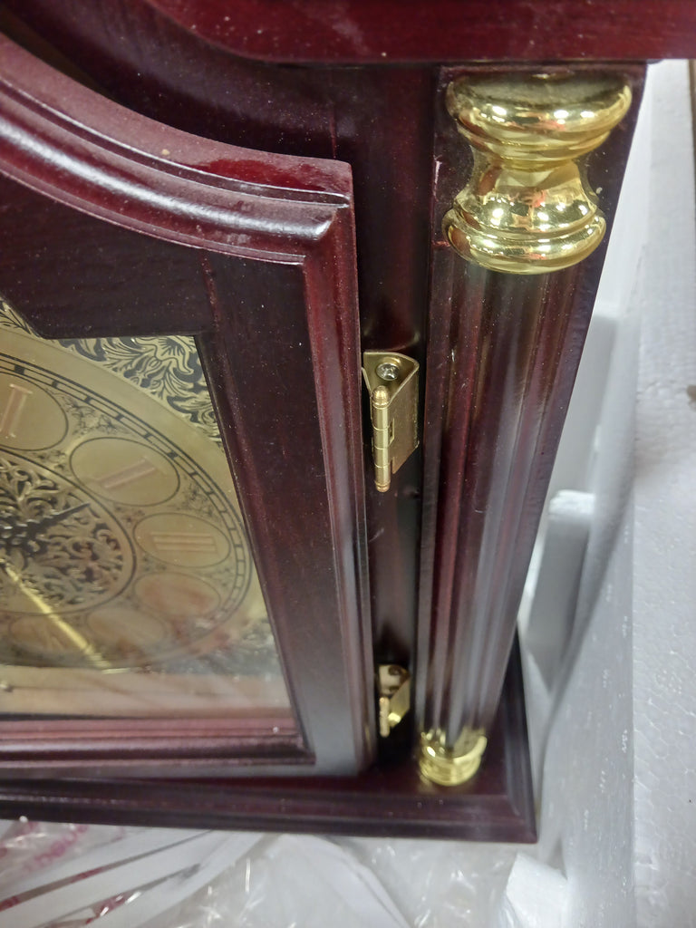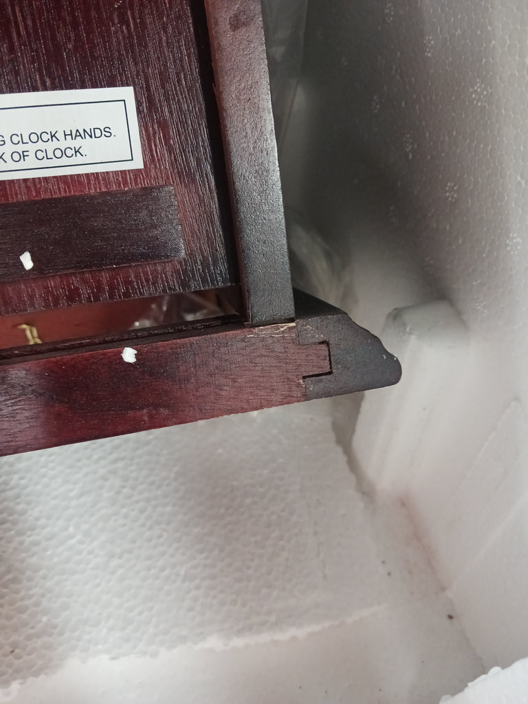 Note: The back of this clock has 2 slight cracks on the base on both corners. The door is slightly crooked on the hinges and needs to be fixed. There is scratching and chipping throughout the wood pieces. The back piece for this clock has a large chip/paint imperfection on it. See the photos provided.