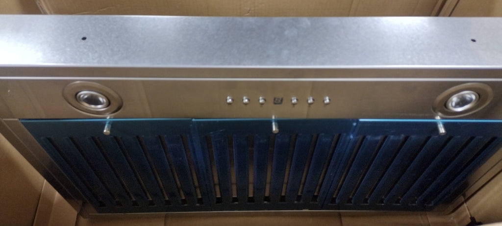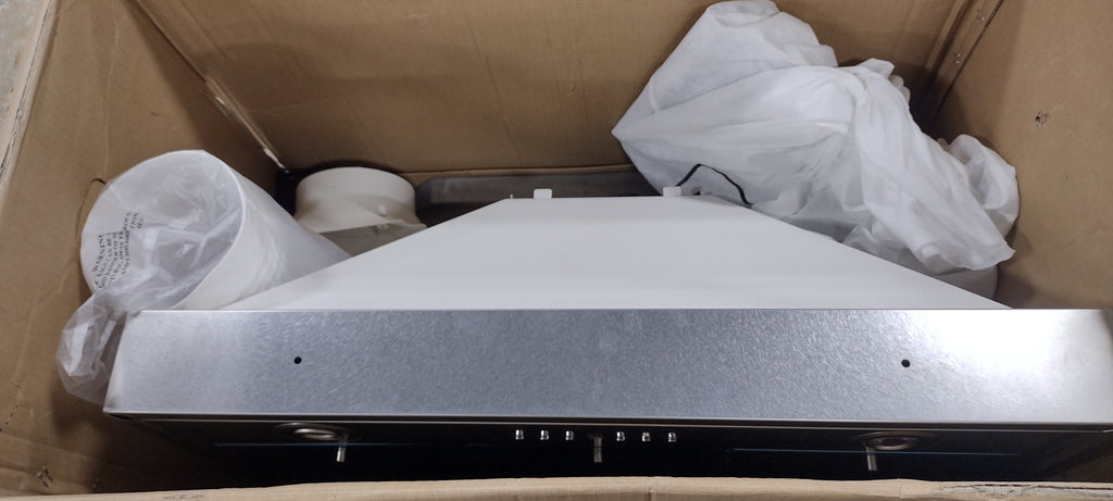 Note: As Is: Missing pieces extension cover, handle not included. Contains range hood, flexible duct, vent cover , crown molding and bracket. Please see in-house photos.
