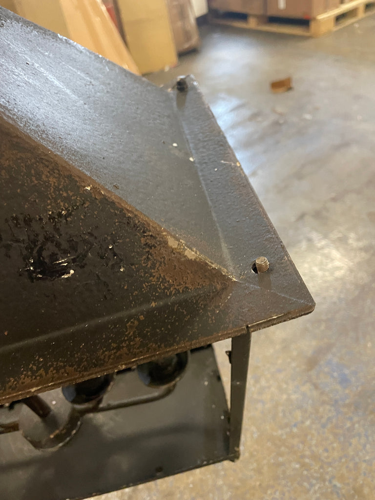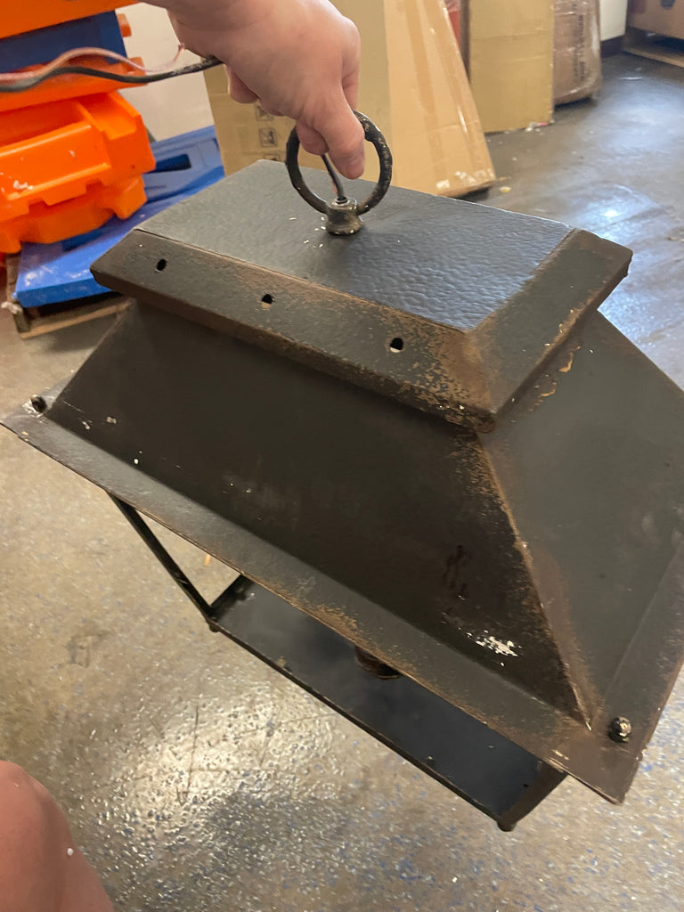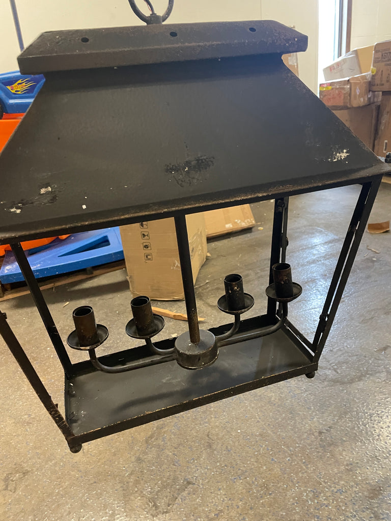 Note: This is out of box and the pictures we've taken do not show the glass, but we have them and they are bubble wrapped. The top is missing one of the 4 small knobs that attached the top to the base but it seems to be very sturdy with the 3 knobs that are attached, see pics. Some of the black iron finish has some imperfections (it is supposed to be rustic), see pics. Overall a rustic but very beautiful Black Iron Pendant. The mount and hanging parts are all in original packaging.