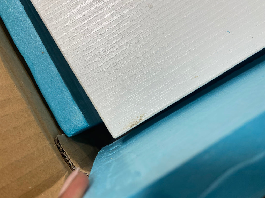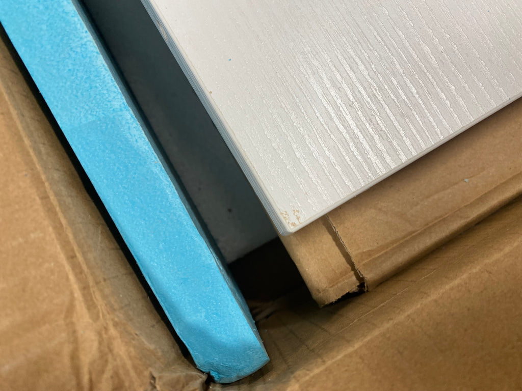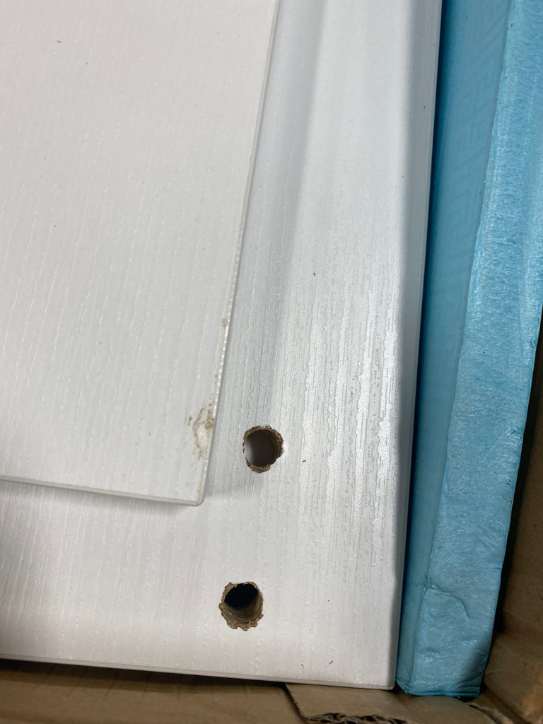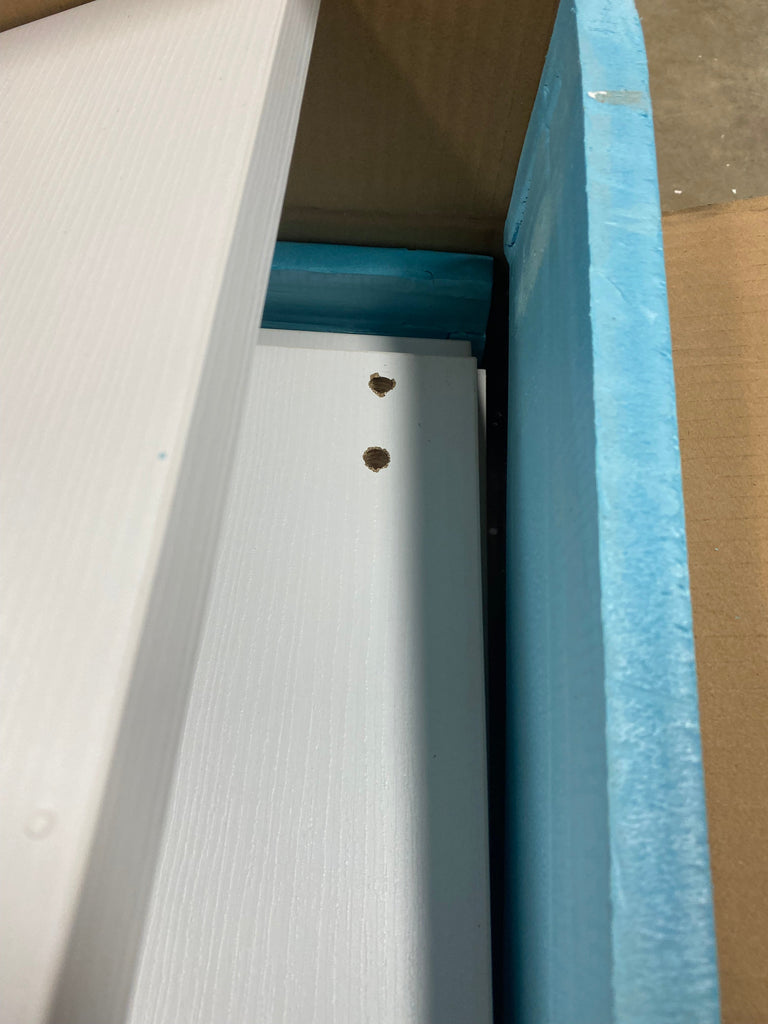 Note: Vanity base ONLY: Item has slight scuffing around cam lock holes/bottom board edges. See photos.