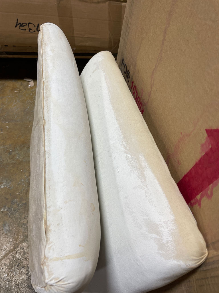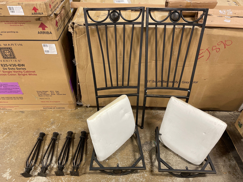 Open box, SET INCLUDES TWO CHAIRS. Not in it's original box. NO instructions included. Hardware is loose, and some may not be included. There are some dust stains on chair seats. Please refer to in house photos for white markings on the framing as well as some marking on the cushion seats. Assembly will be required.