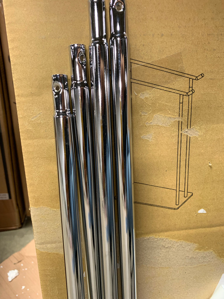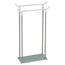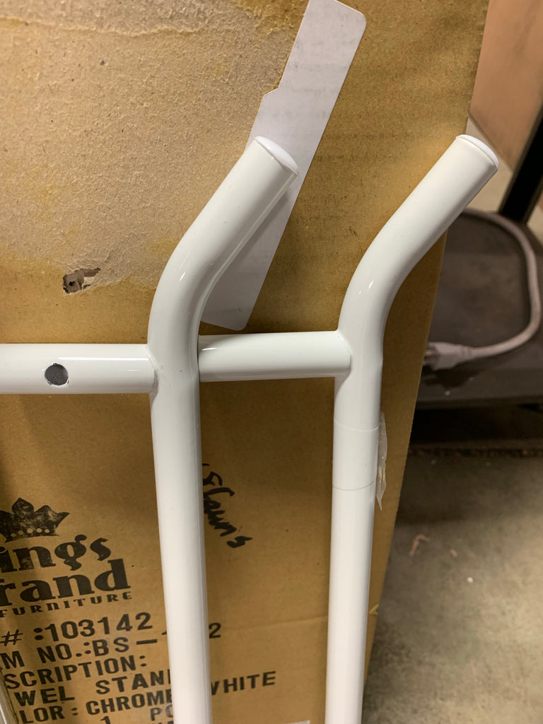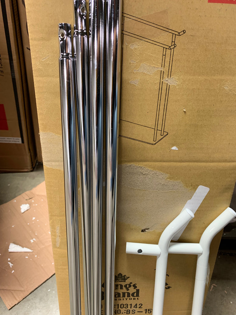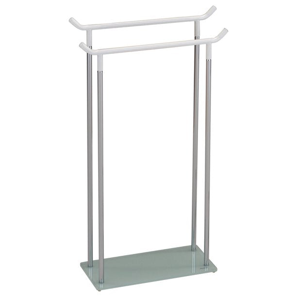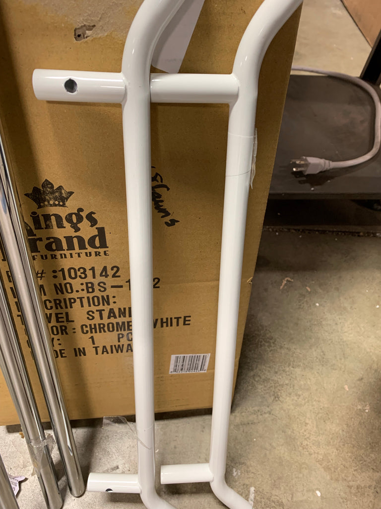 Very stable with its heavy rectangular tempered solid white glass base. Finish: White Bars; Chrome Frame; Frosted Base. Materials: Metal Frame; Tempered Glass Base Overall Dimensions: 19"W x 8"D x 32"H Simple assembly required. -Open Box Item, Requires Assembly, (1 Towel Stand) ( All Pieces Are In Box, Including Bolts & Screws)
