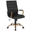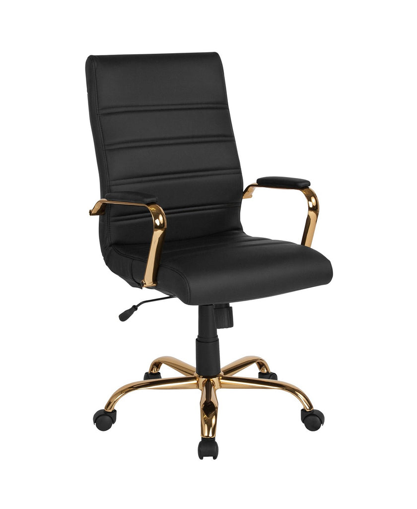 this stylish Mid-Back Leather Office Chair with Chrome Arms that is highlighted with attractive horizontal stitching. -Open Box Item (All Pieces are in Box ), 1 Black LeatherSoft Upholstery, Color: Black And Gold