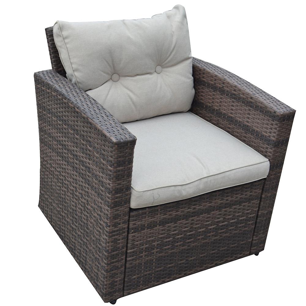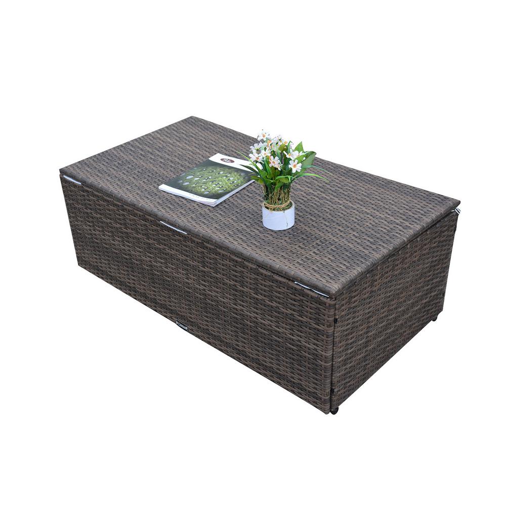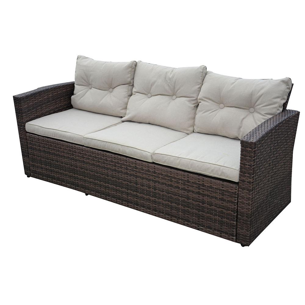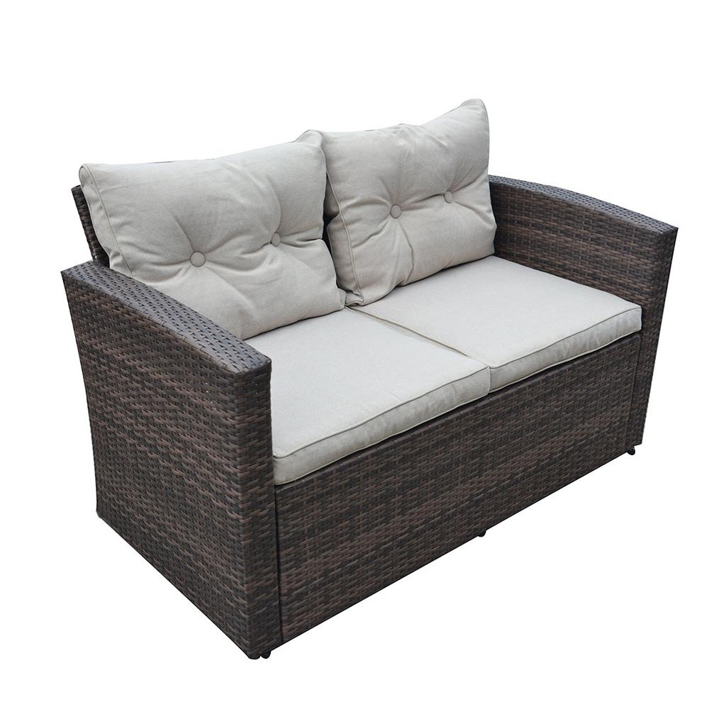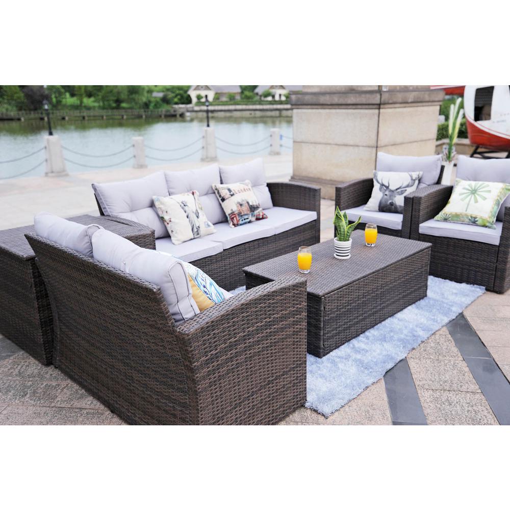 This outdoor set is an open box item. All parts have been taken out and accounted for, including hardware and assembly instructions. Both can be found in the storage bin. Set includes one sofa, one loveseat, two arm chairs, one storage table, one storage bin and 7 white seat/back cushions. Table also offers storage. Wicker is grey with white cushions. Please see all photos and the link below for more details.