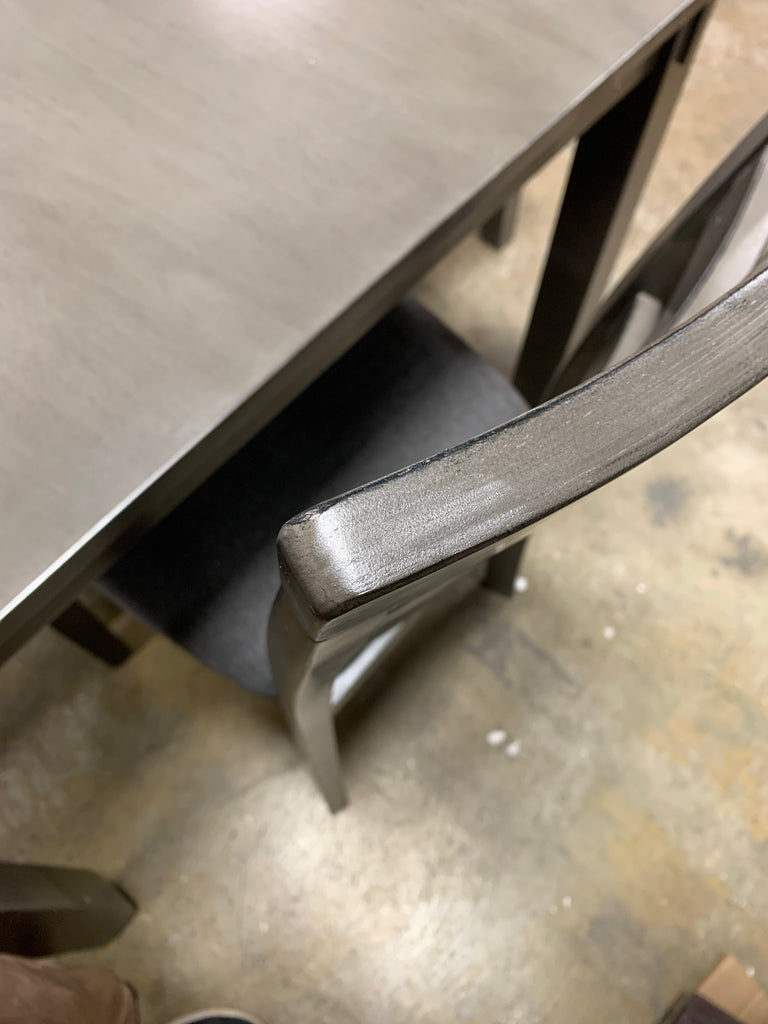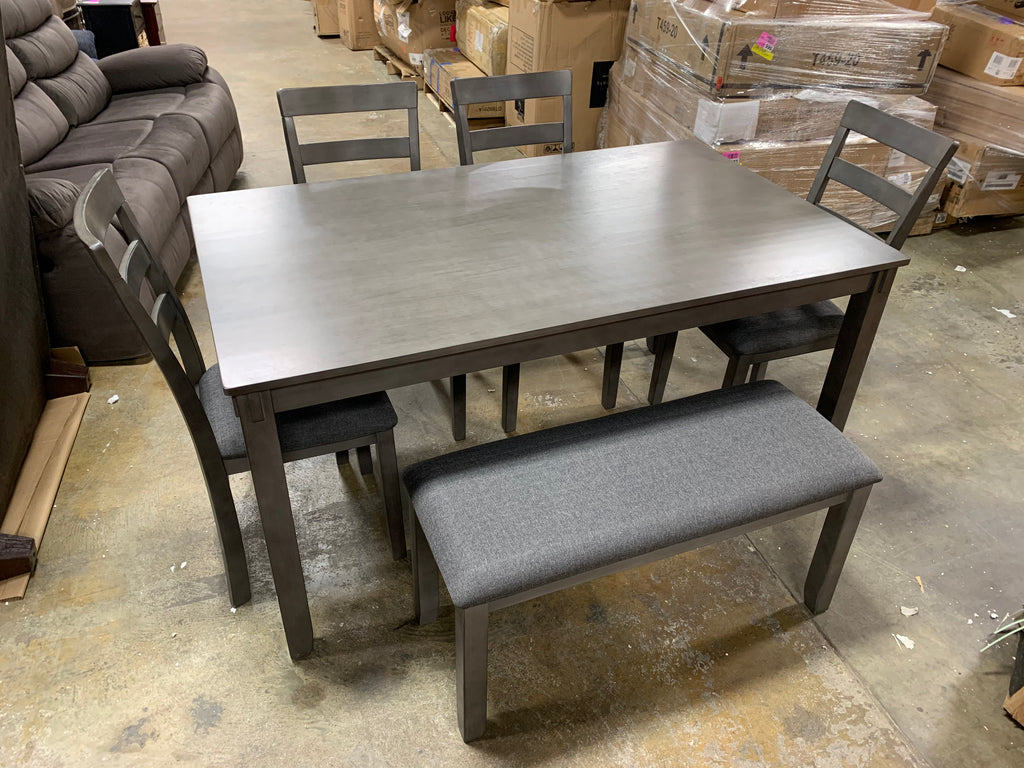 This dining set is in great condition. Out of the box, no assembly required. Two chairs have a wobble because they are missing one leg pad. Some very small scuffs on one chair and the edge of the table. Seats 6 - four chairs, one bench, and one table included. Please see all photos and the link below for more details.