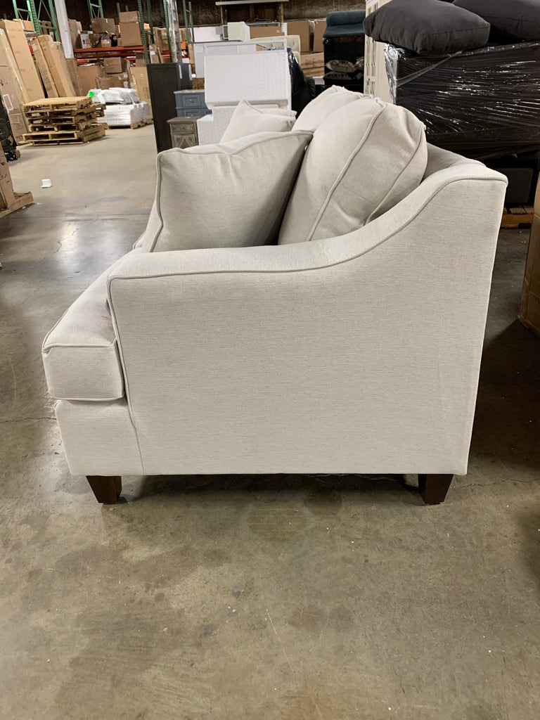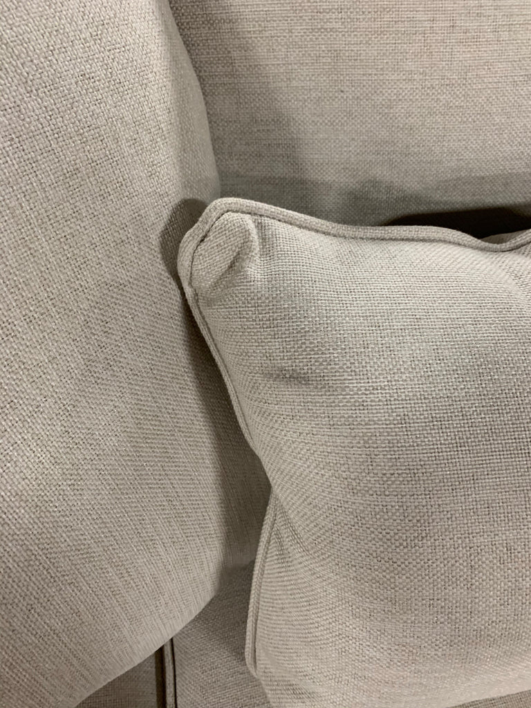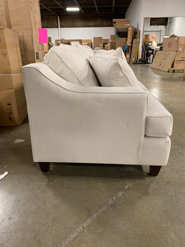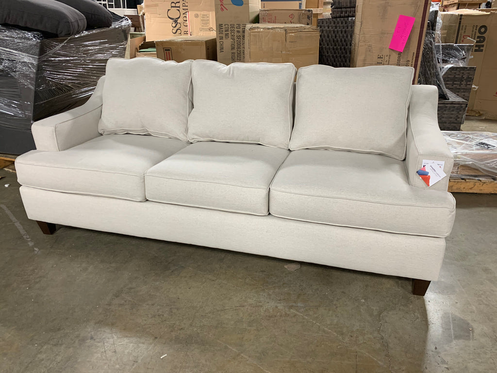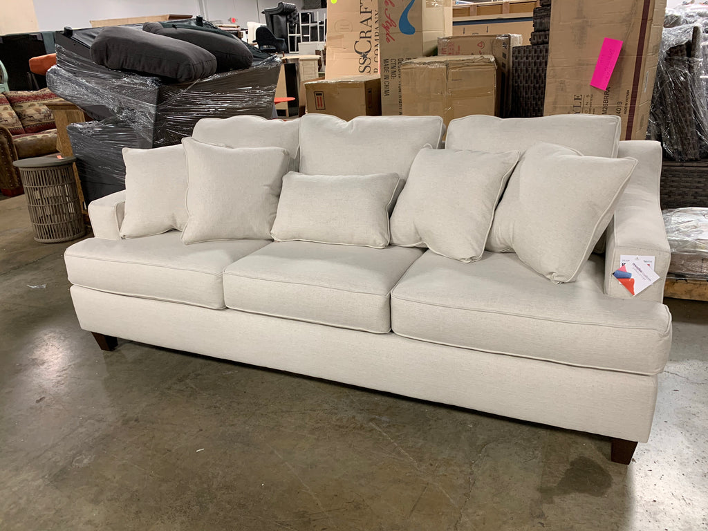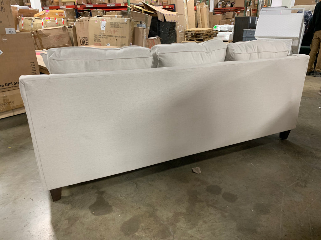 Sofa is in great out of box condition. Only imperfection to mention is that there is a very small amount of warehouse dust on a pillow. Please see all photos.