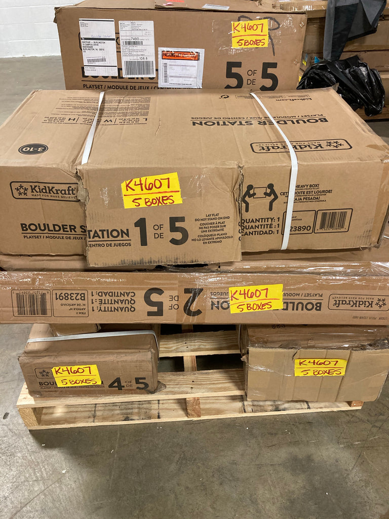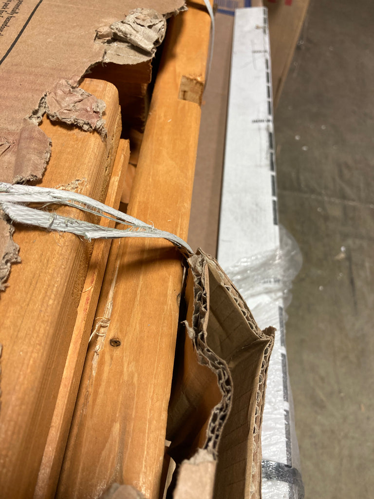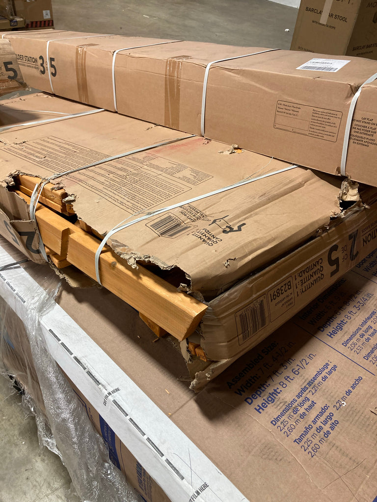 ** AS IS - This is a 5 box item, and all 5 boxes are in the manufacturer's original packaging. One box is open on the end. No major damage is visible. Minor damage on ends of some wood pieces. There is a chance of missing wood pieces or parts customer will need to obtain. All sales final. See pictures for details. **