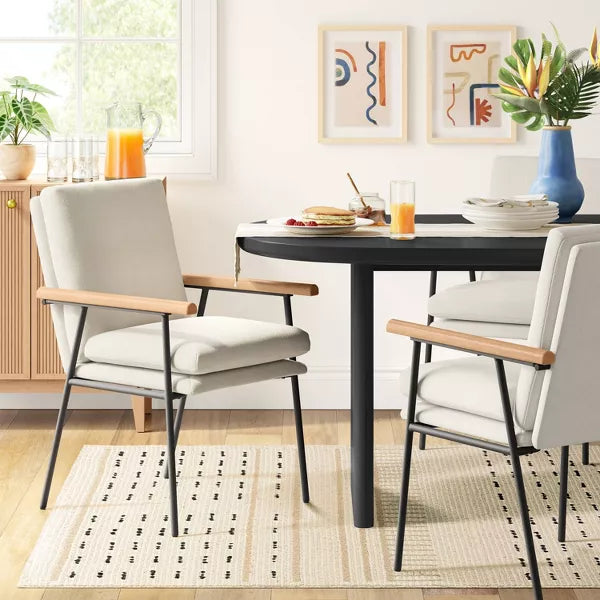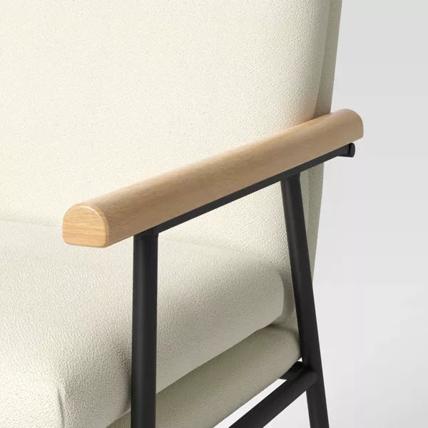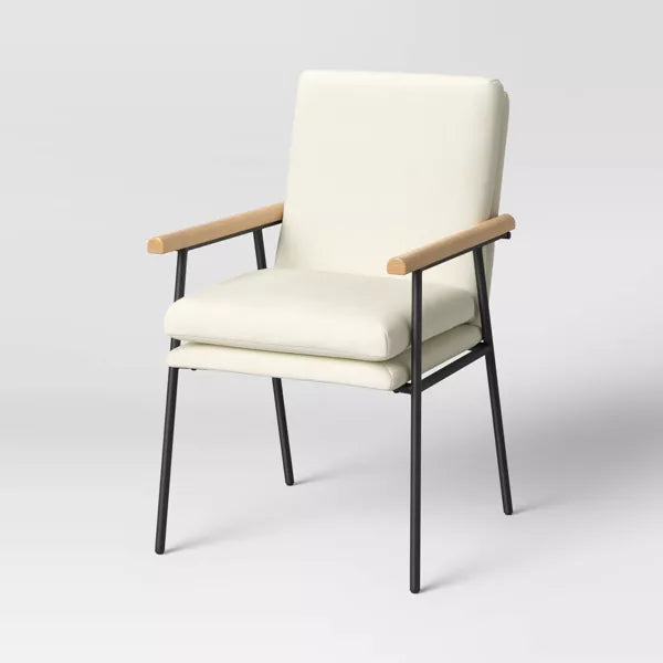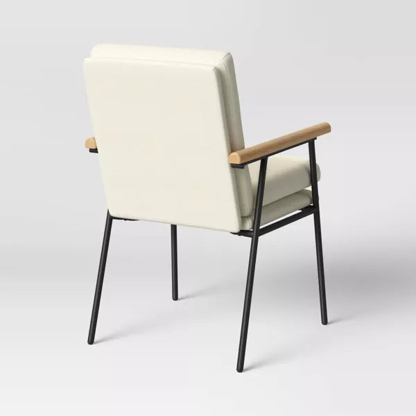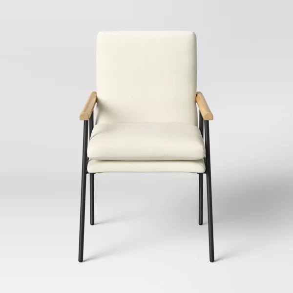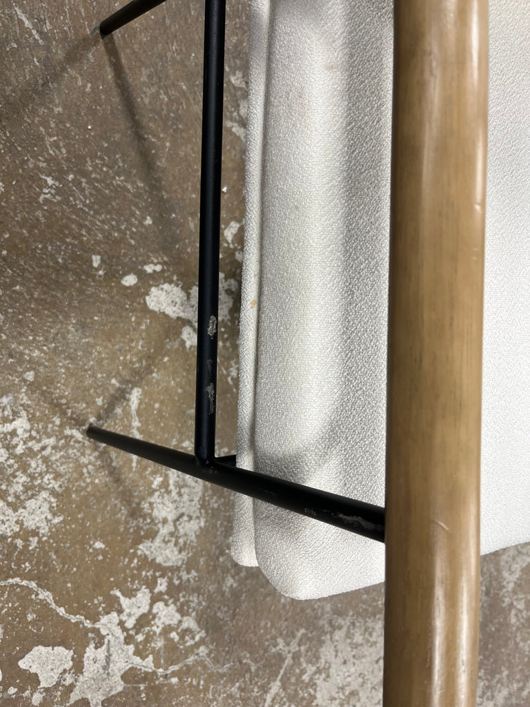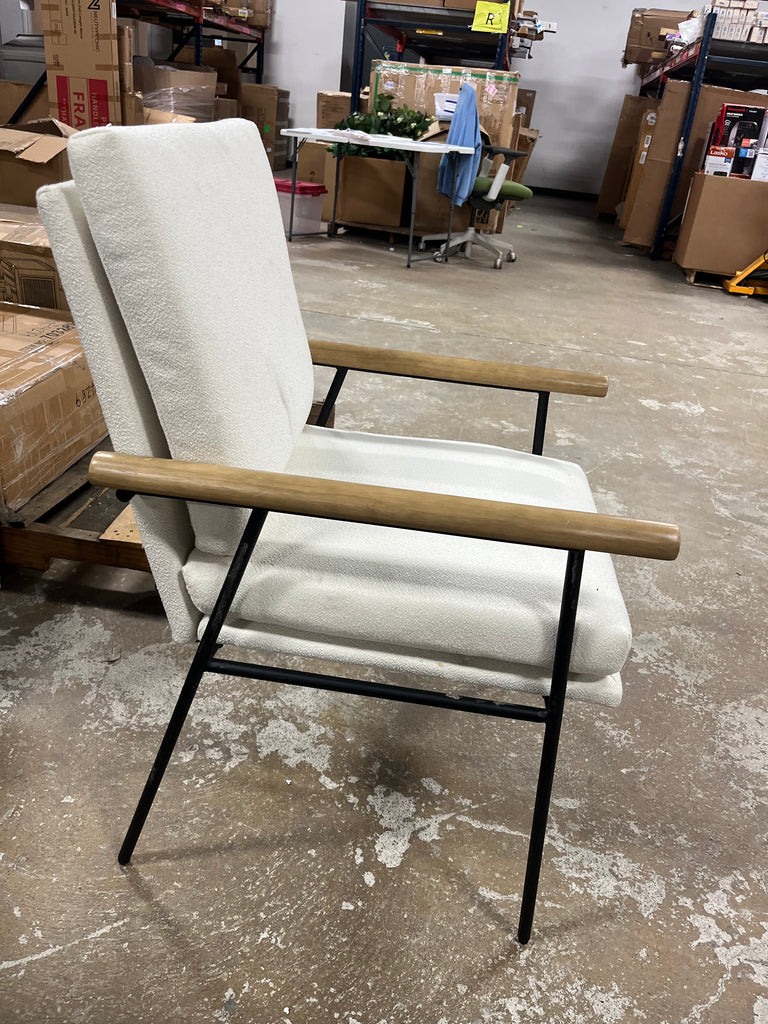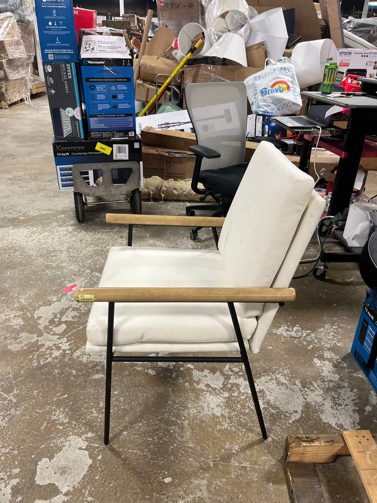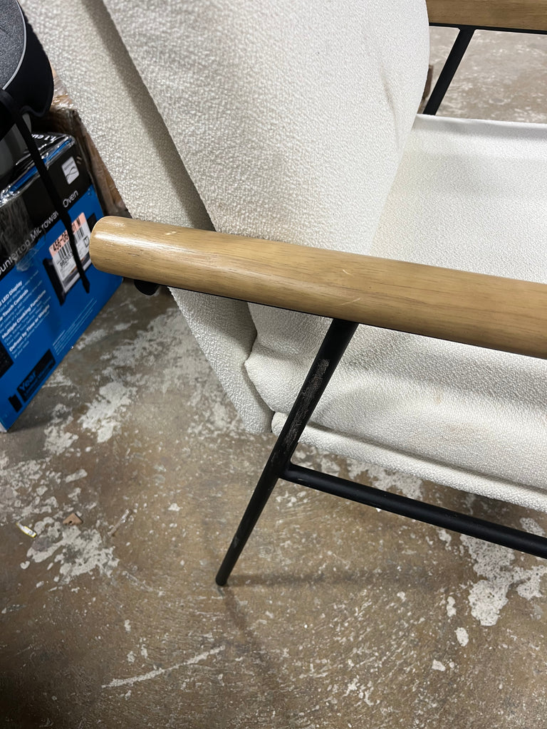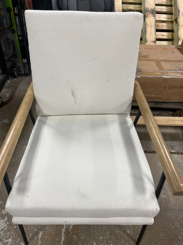 Note: NOTICE. Chair has some dark marks on the cushioned areas in some places. There is some wear and tear on the metal legs. And the wood arm rests have a few scuffs and scrapes. See pictures for more details.