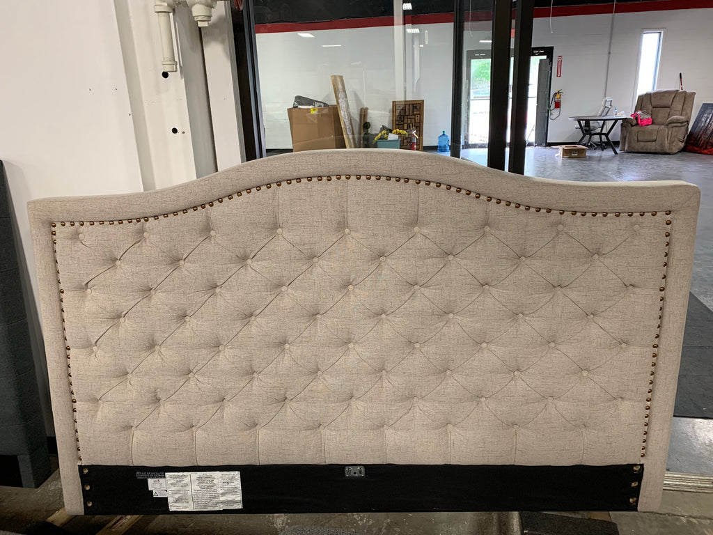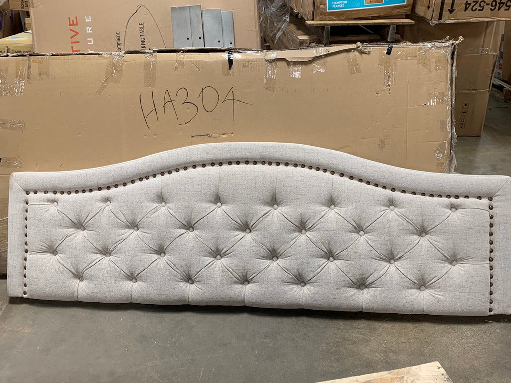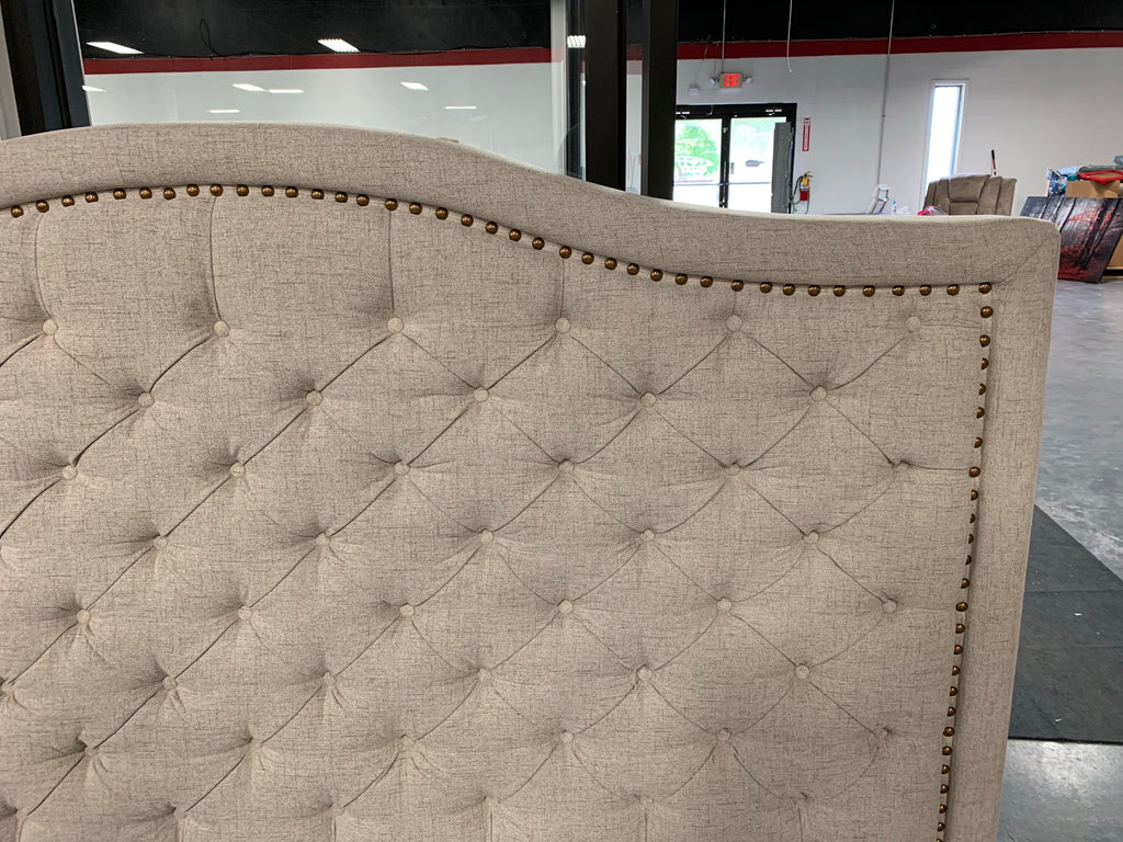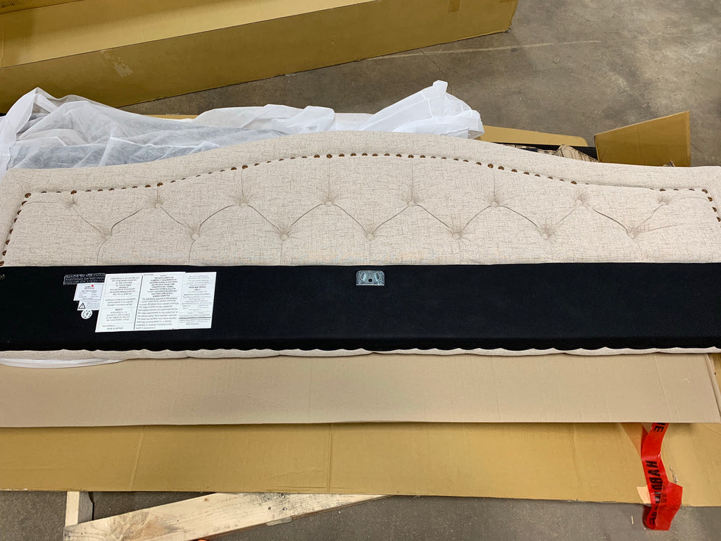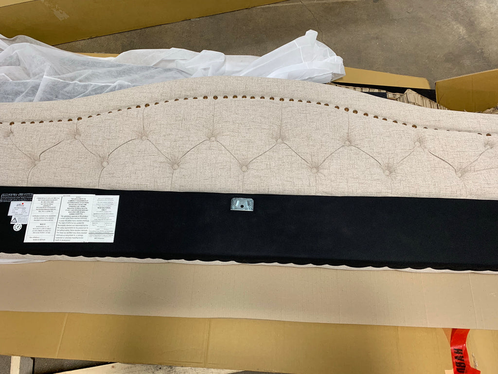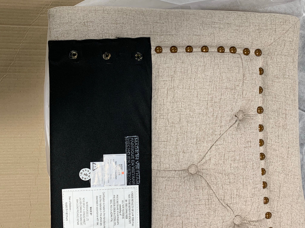 The generously-padded, panel-style construction is studded with handsome color-matched button tufting and outlined in elegant aged brass nailhead trim for a traditional touch. The soft beige linen-like fabric is made from 100% polyester for superior durability and easy maintenance. - Headboard & Footboard All Is Included, Headboard: out of box Footboard & Rails: In Box , (Requires Assembly)