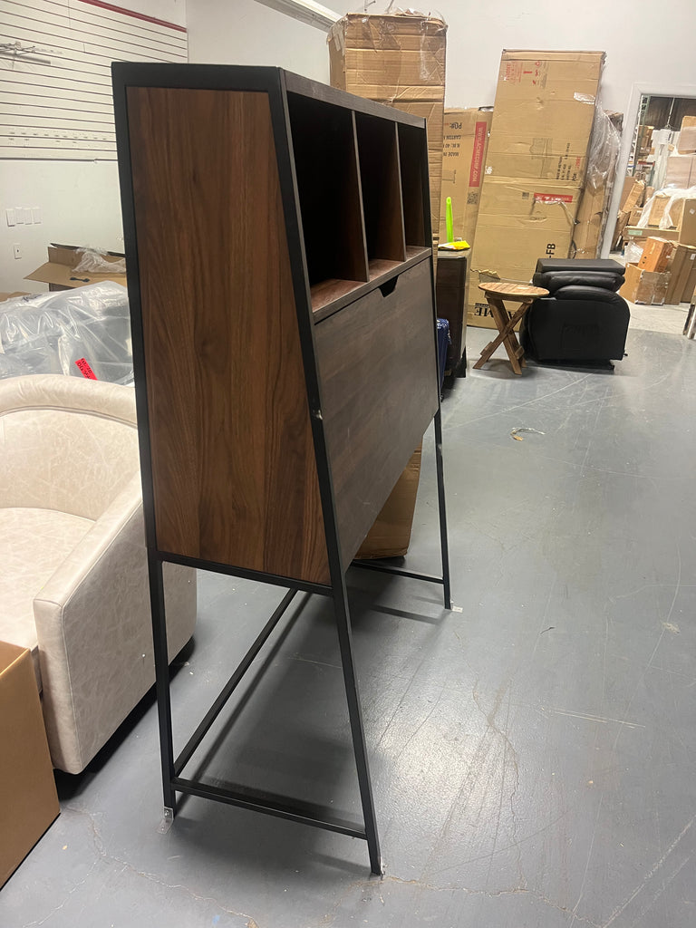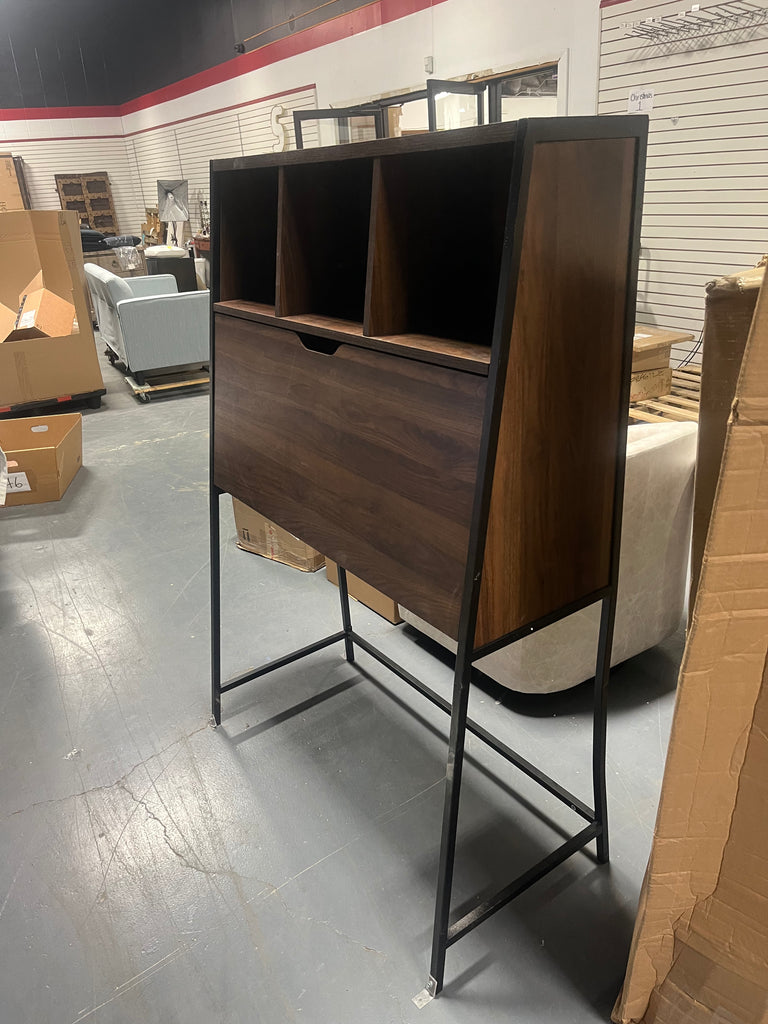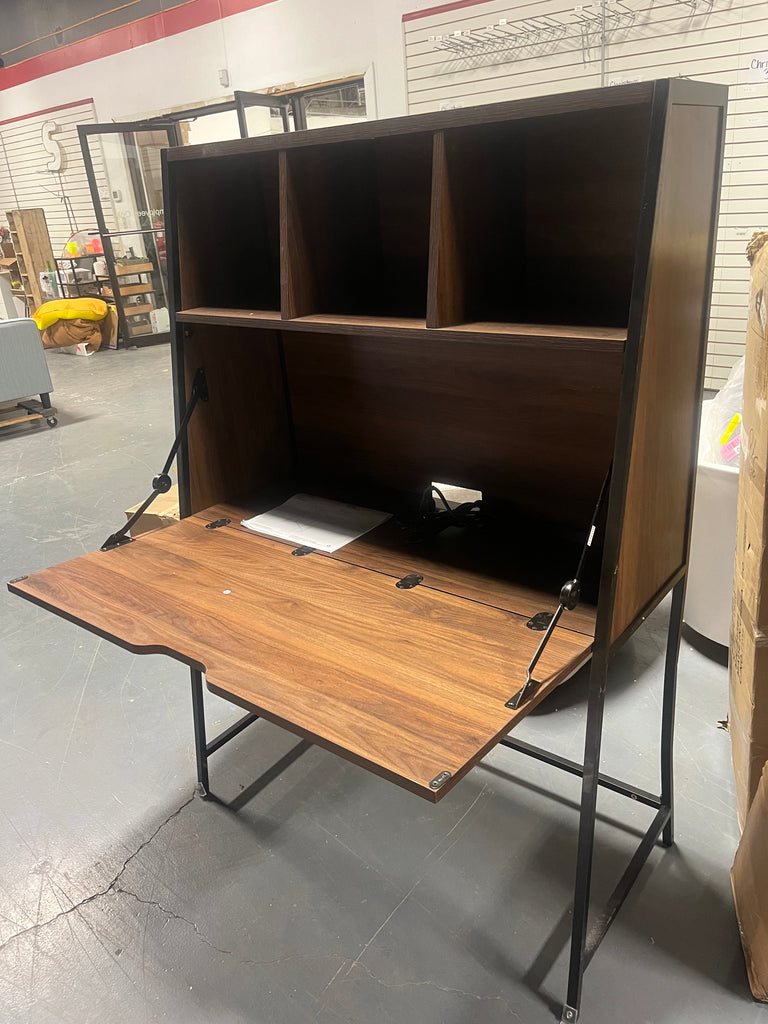 Note: This desk was previously a display and has some plastic brackets attadhed to bottom that can be removed. There are a couple spots on the metal base that are bent and have paint missing and base will need to be tightened. Back panel could use a couple extra screws but not necessary for stability. See in house photos or details.