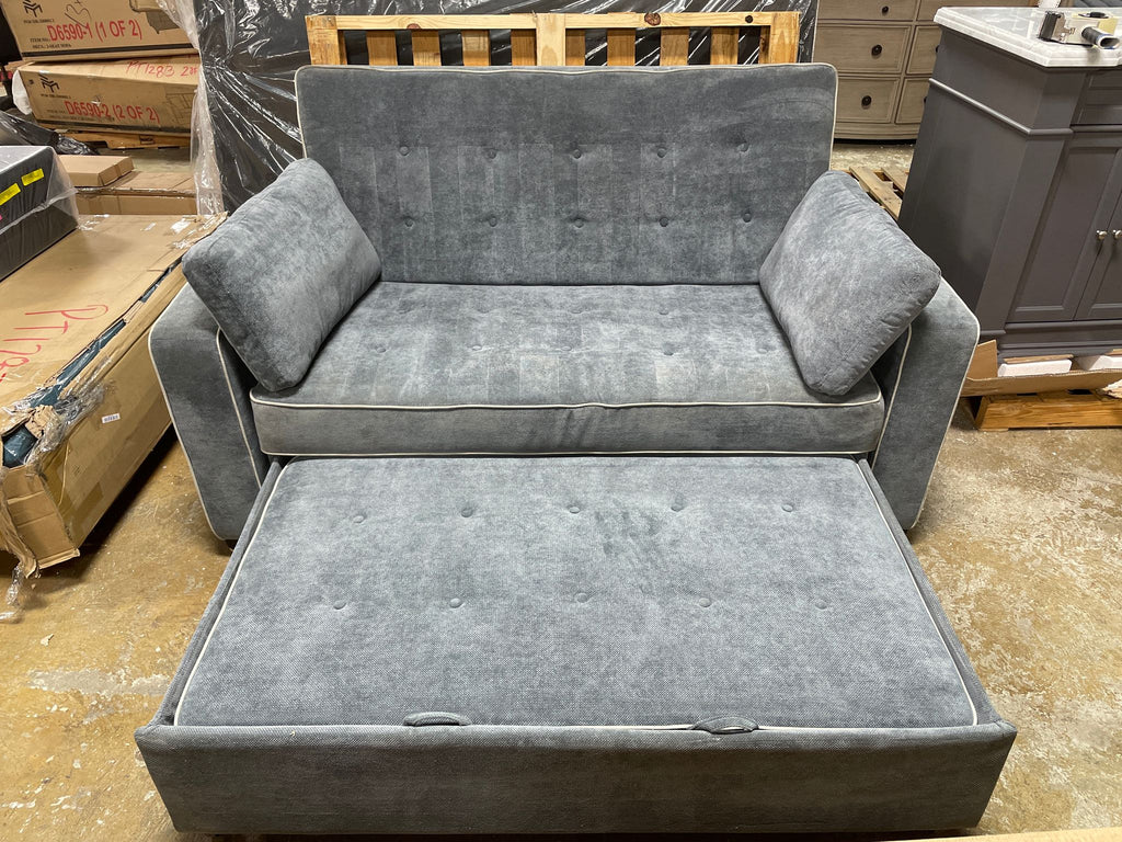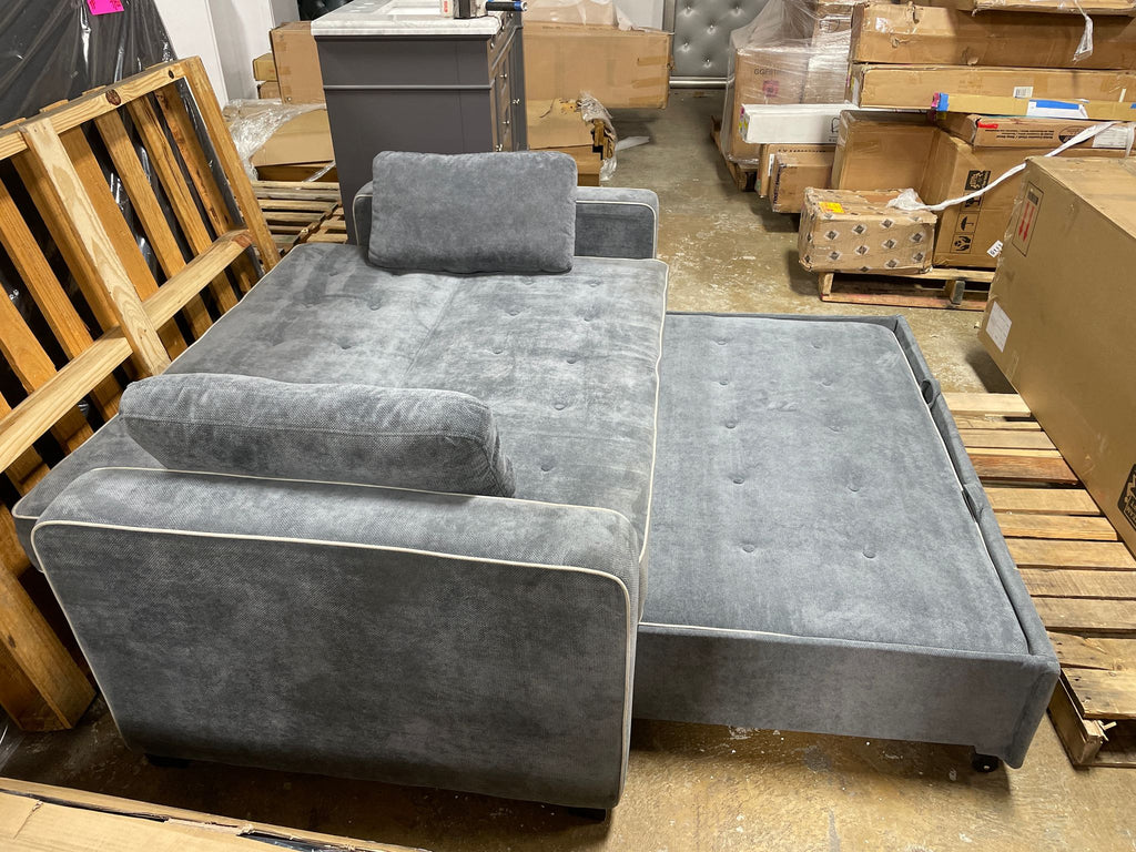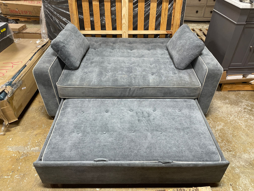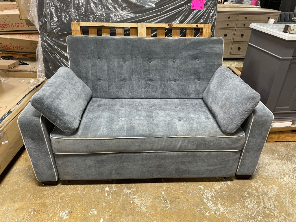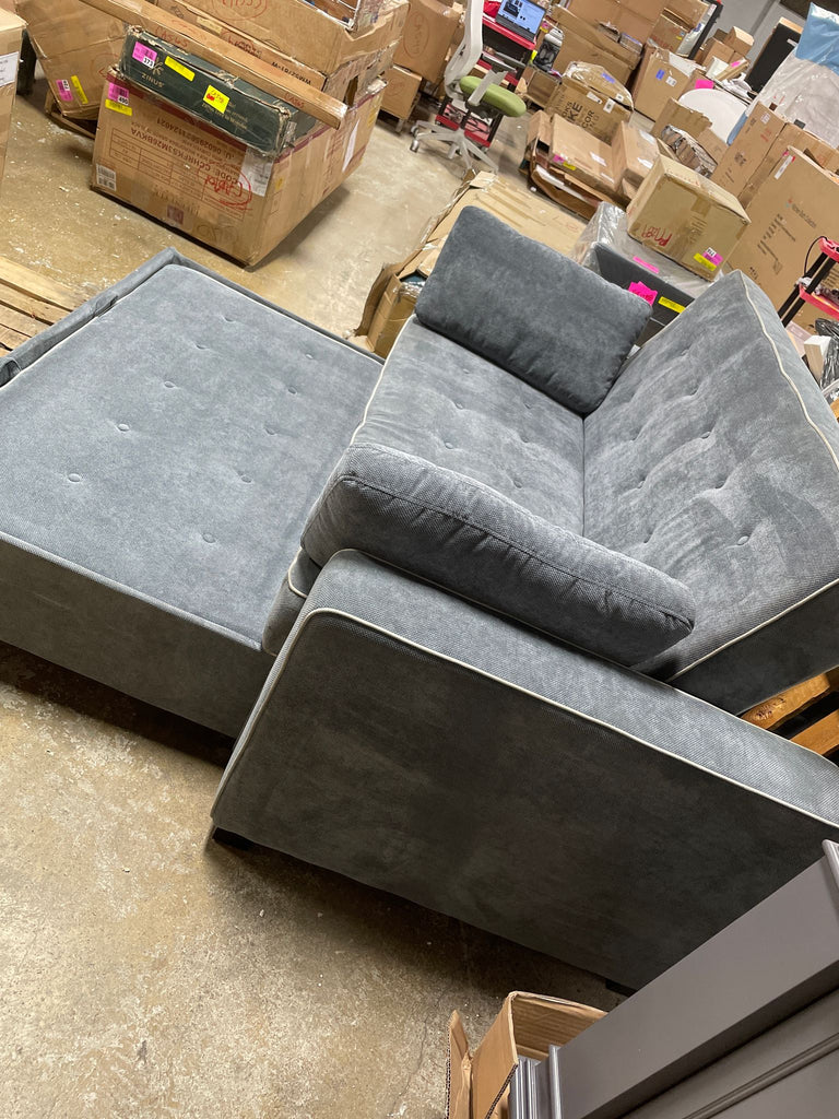 Open box, The color is Gray/Microfiber, Please refer to in house photos. There is some warehouse dirt/dust on parts of the sofa.