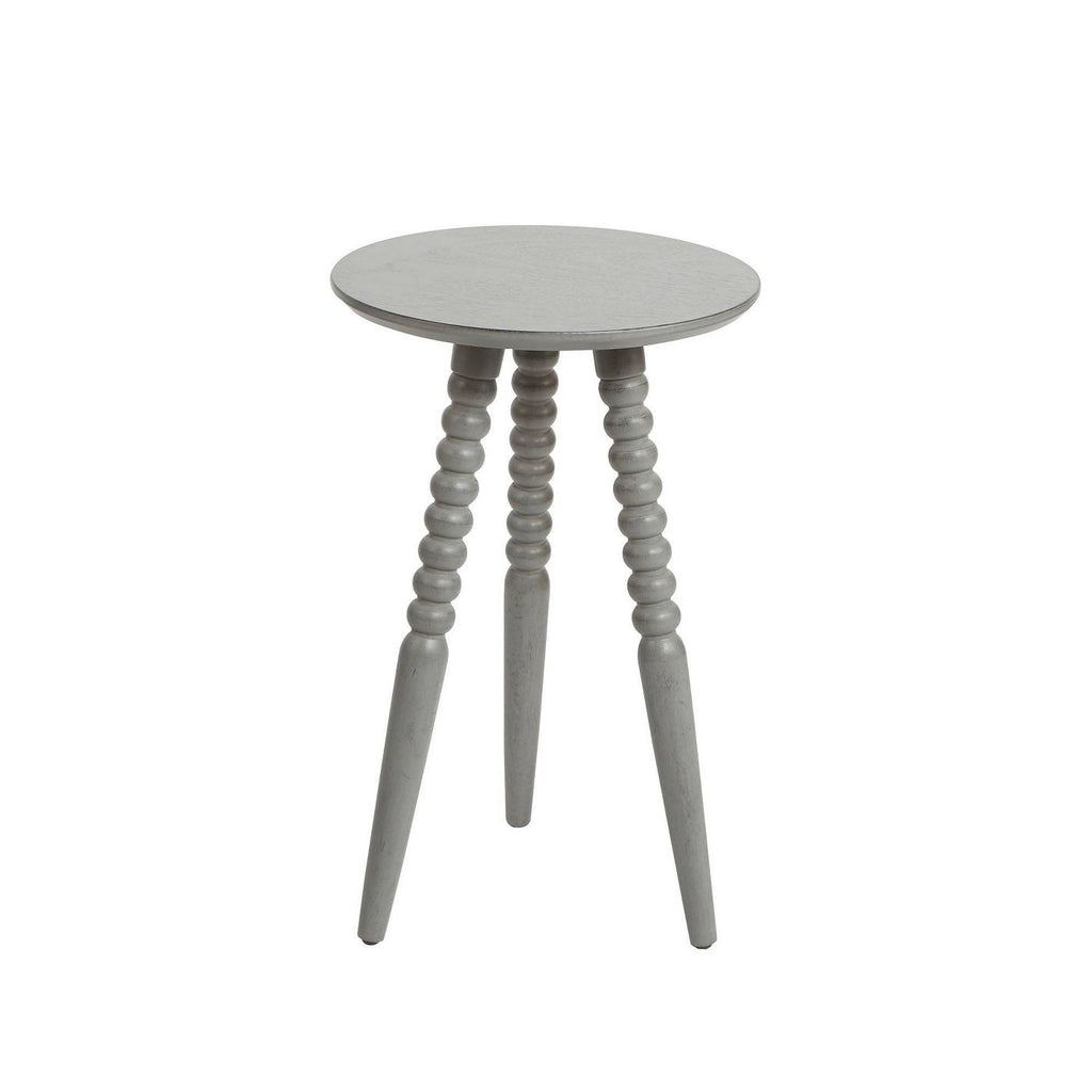 Round Accent Table with Turned Legs in Gray. In box item, requires assembly. See link for further details