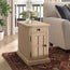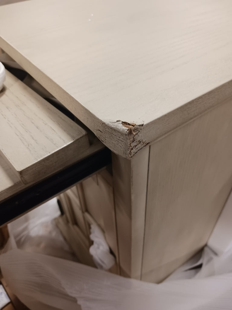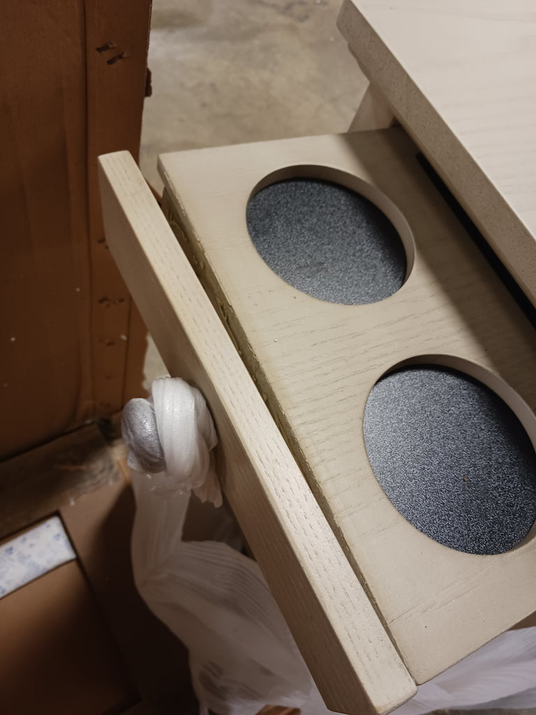Note: This end table has a large ding/crack in one corner. The cup holder drawer piece with the knob needs to be re-screwed back into the end table. See the photos provided.