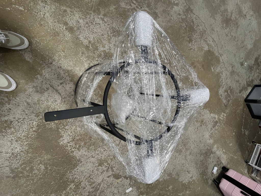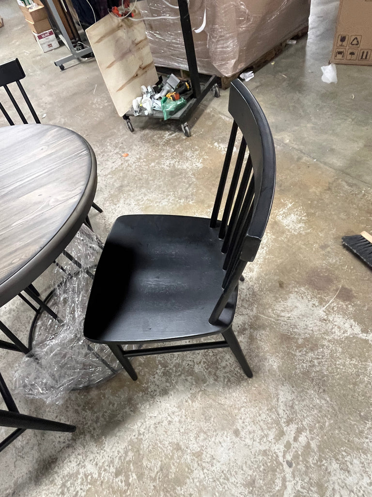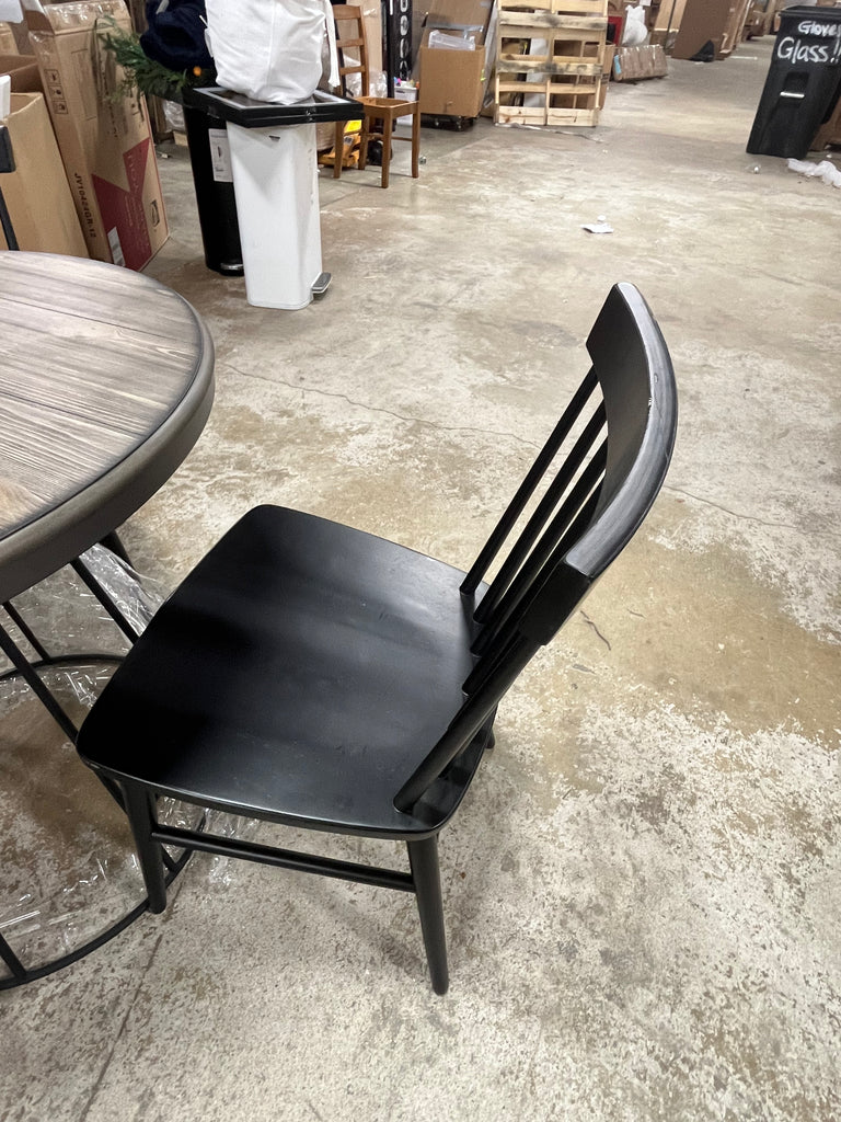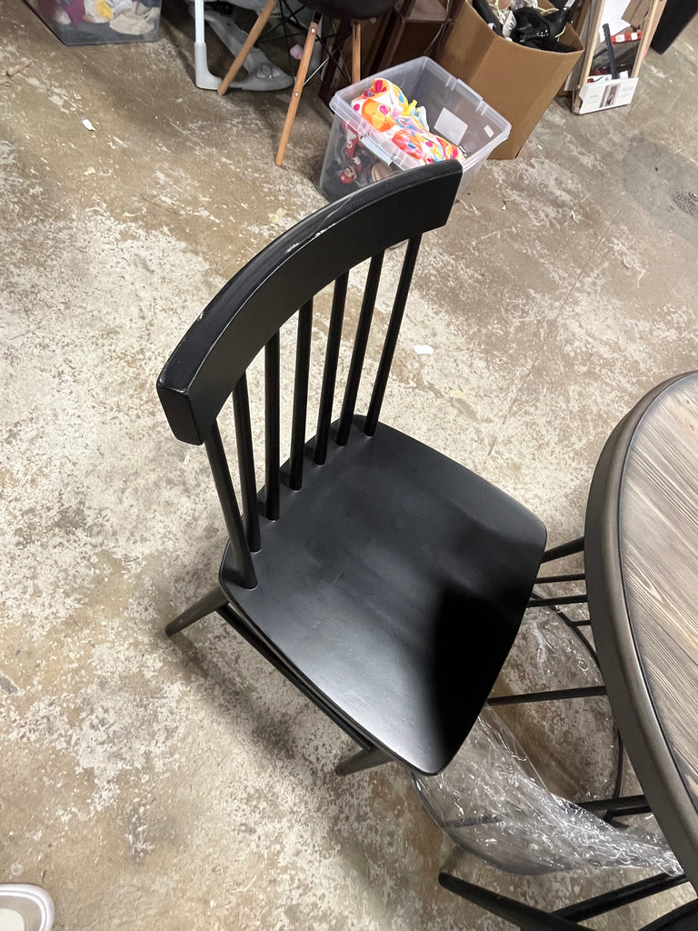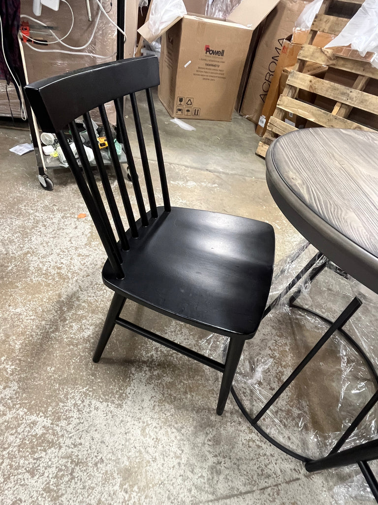 Base and top are in box, chairs are not. Chairs are black and 18" from the ground to the seat.