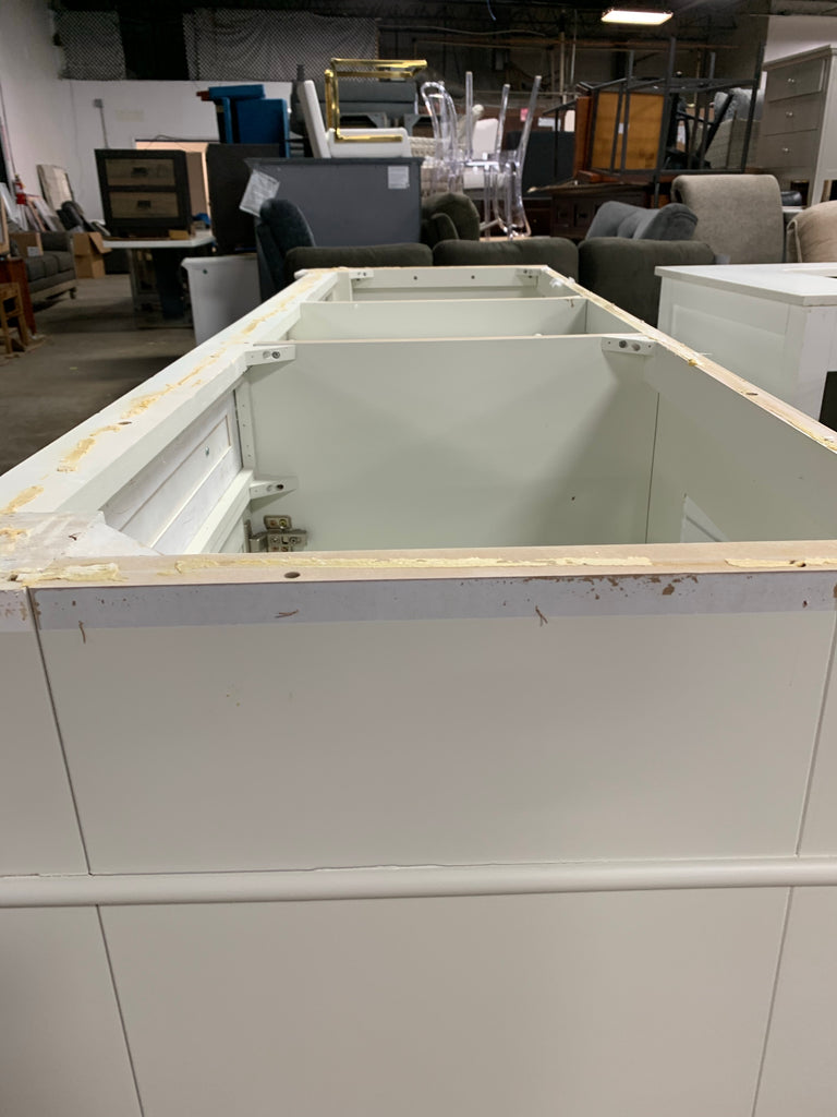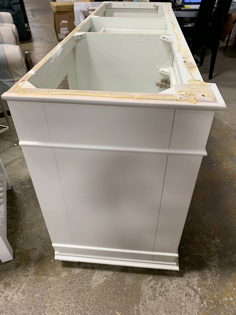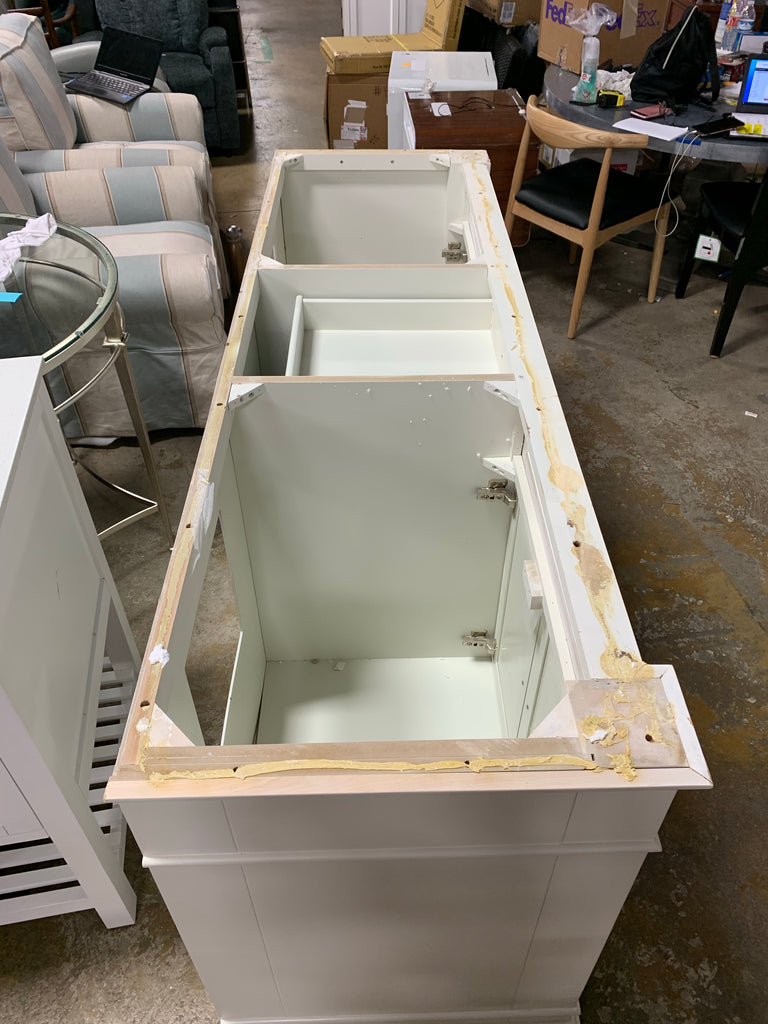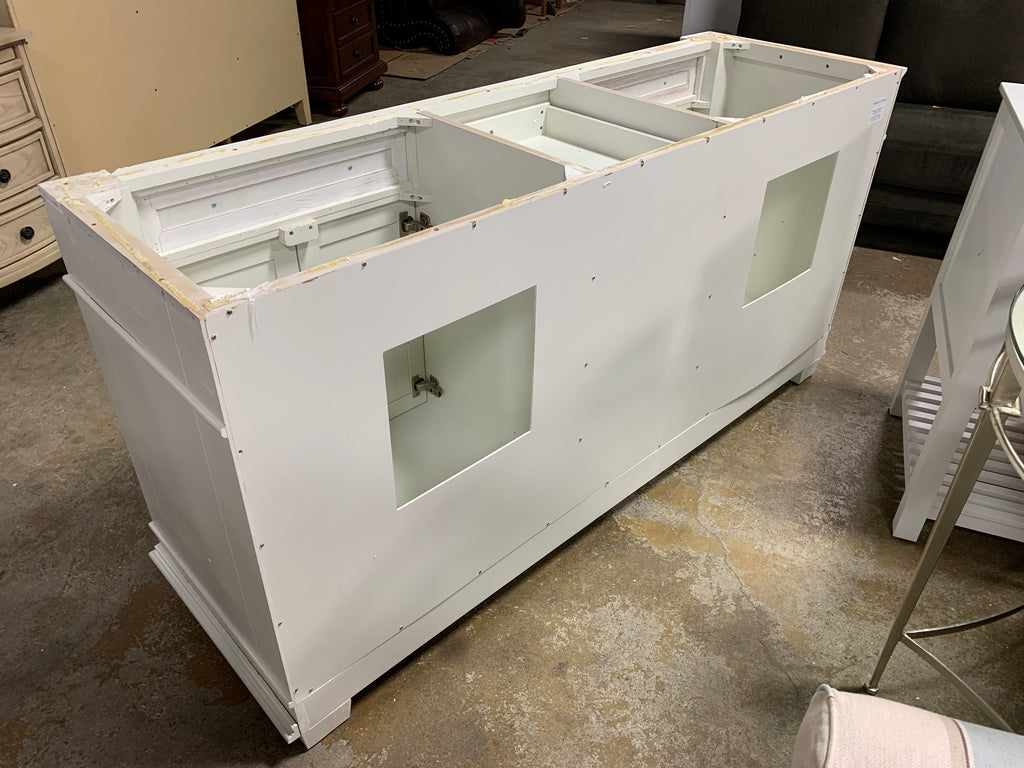 This vanity is in great condition. No counter top or sinks. Some small marks on the top right side where counter top was removed- shown in photos. Please see all photos and the link below for more details.