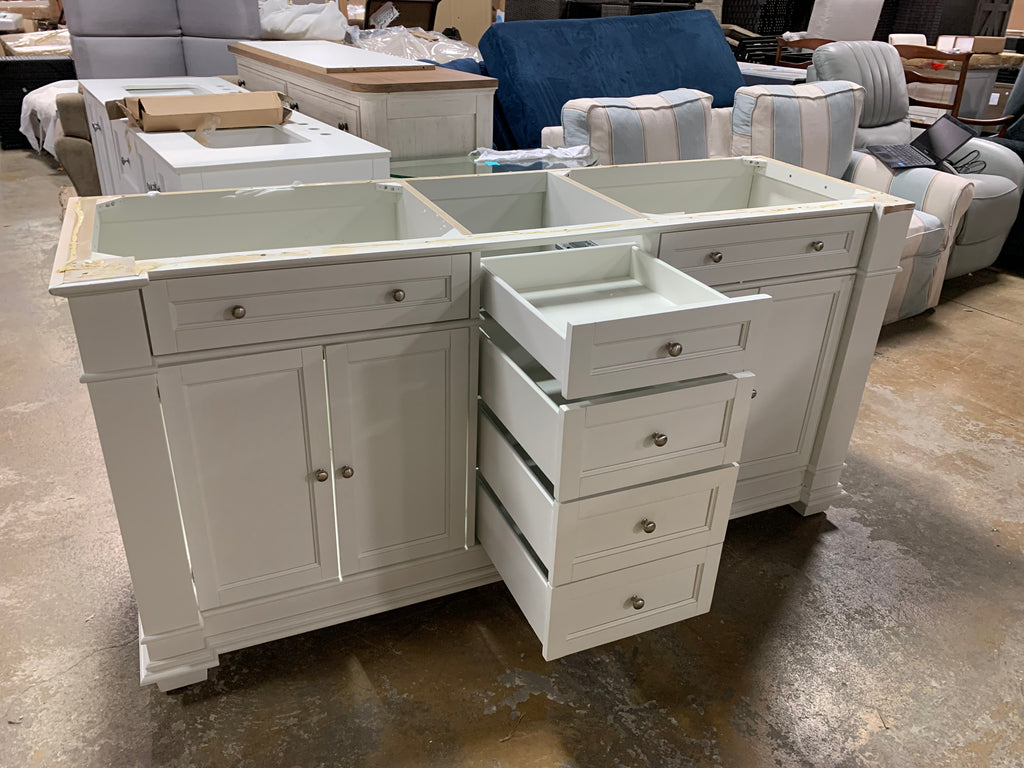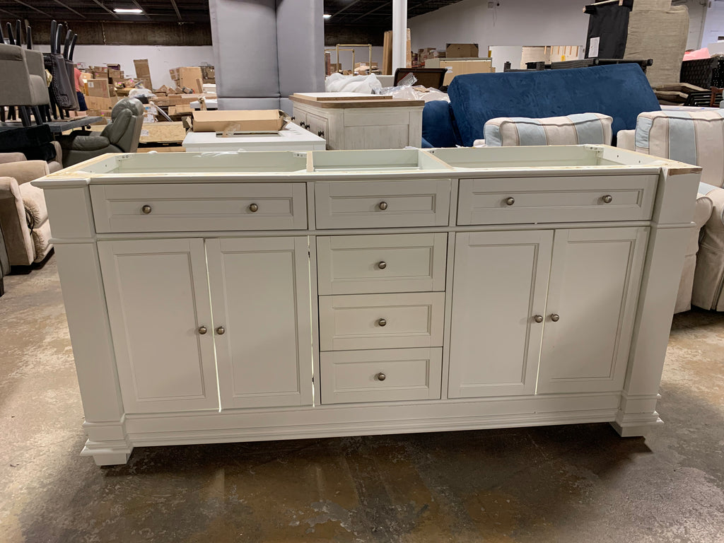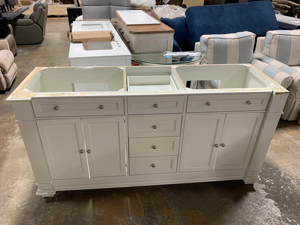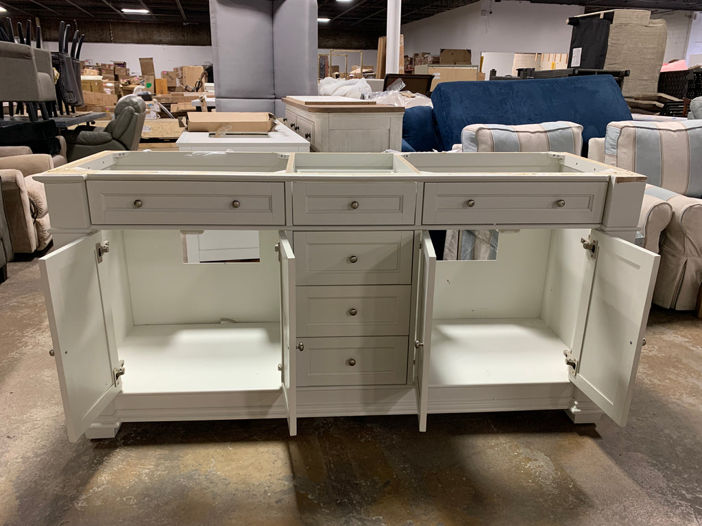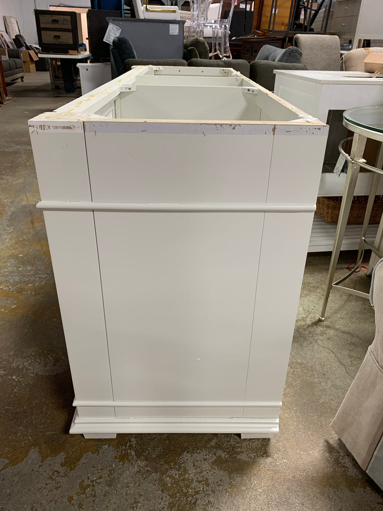 This vanity is in great condition. No counter top or sinks. Some small marks on the top right side where counter top was removed- shown in photos. Please see all photos and the link below for more details.
